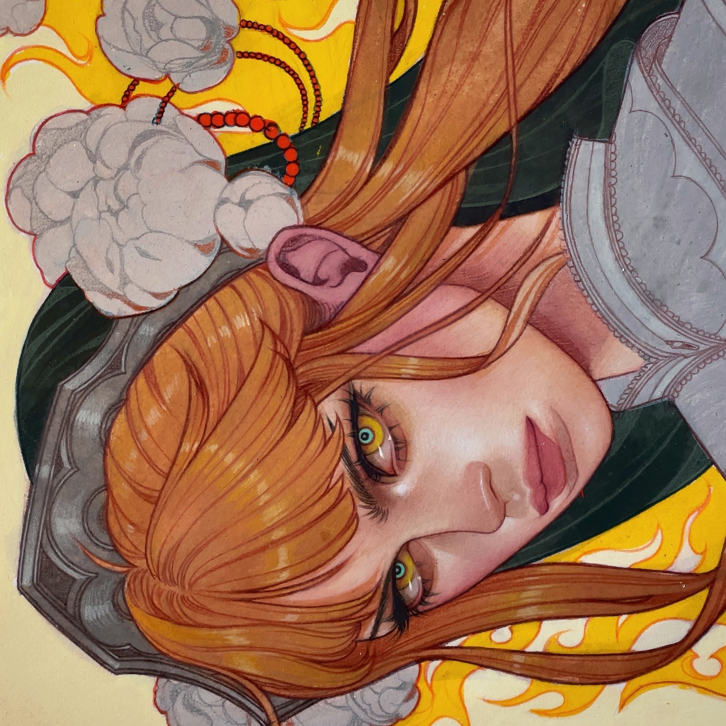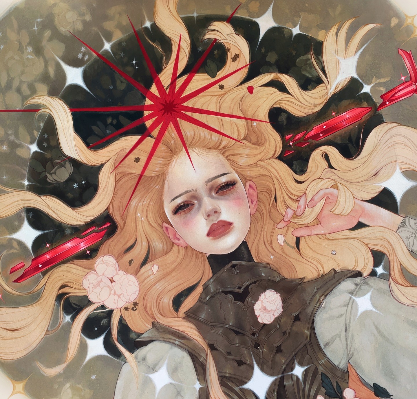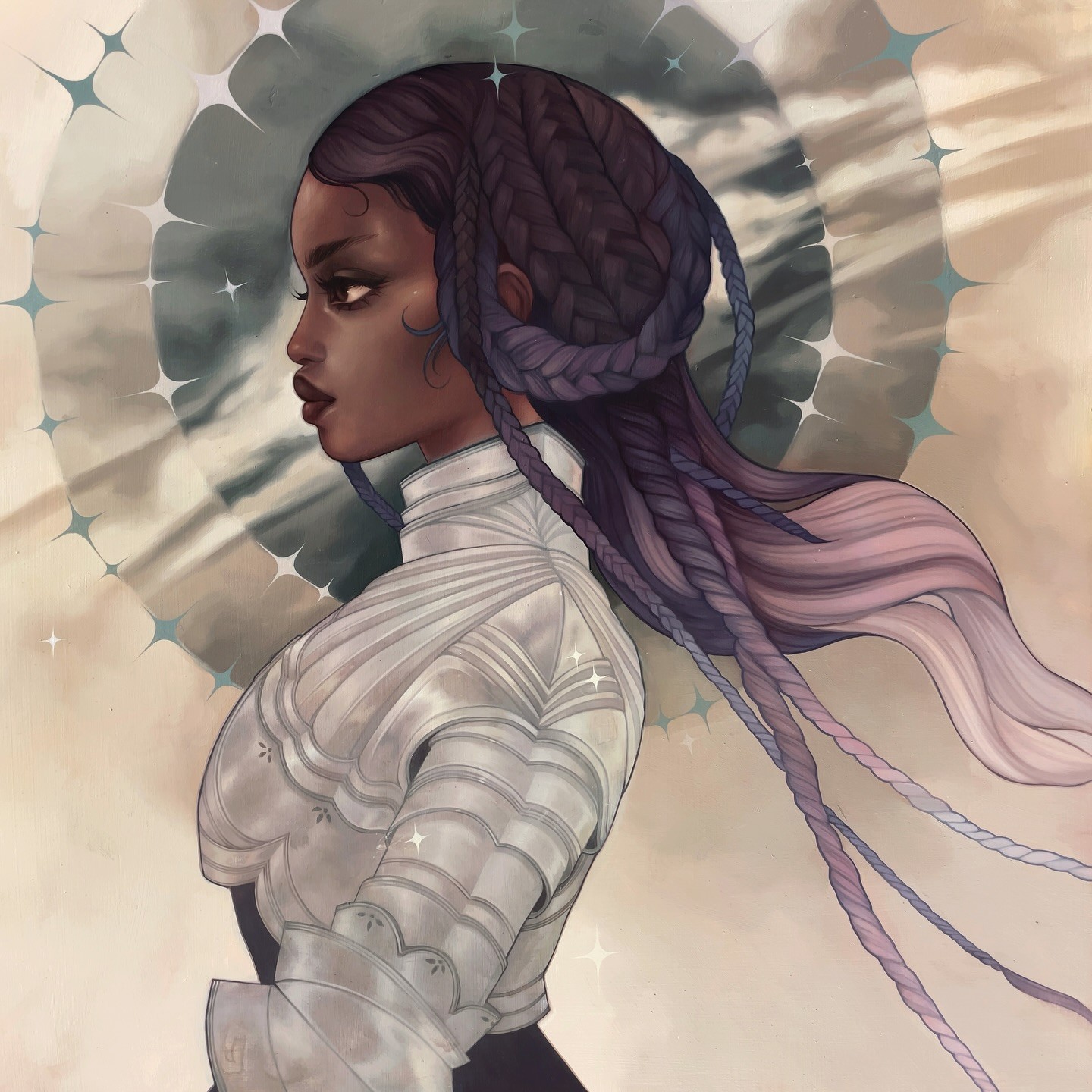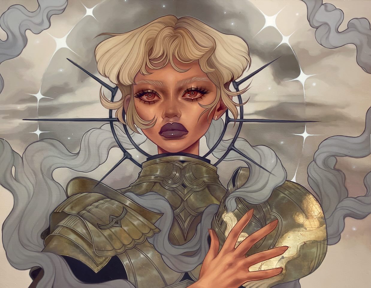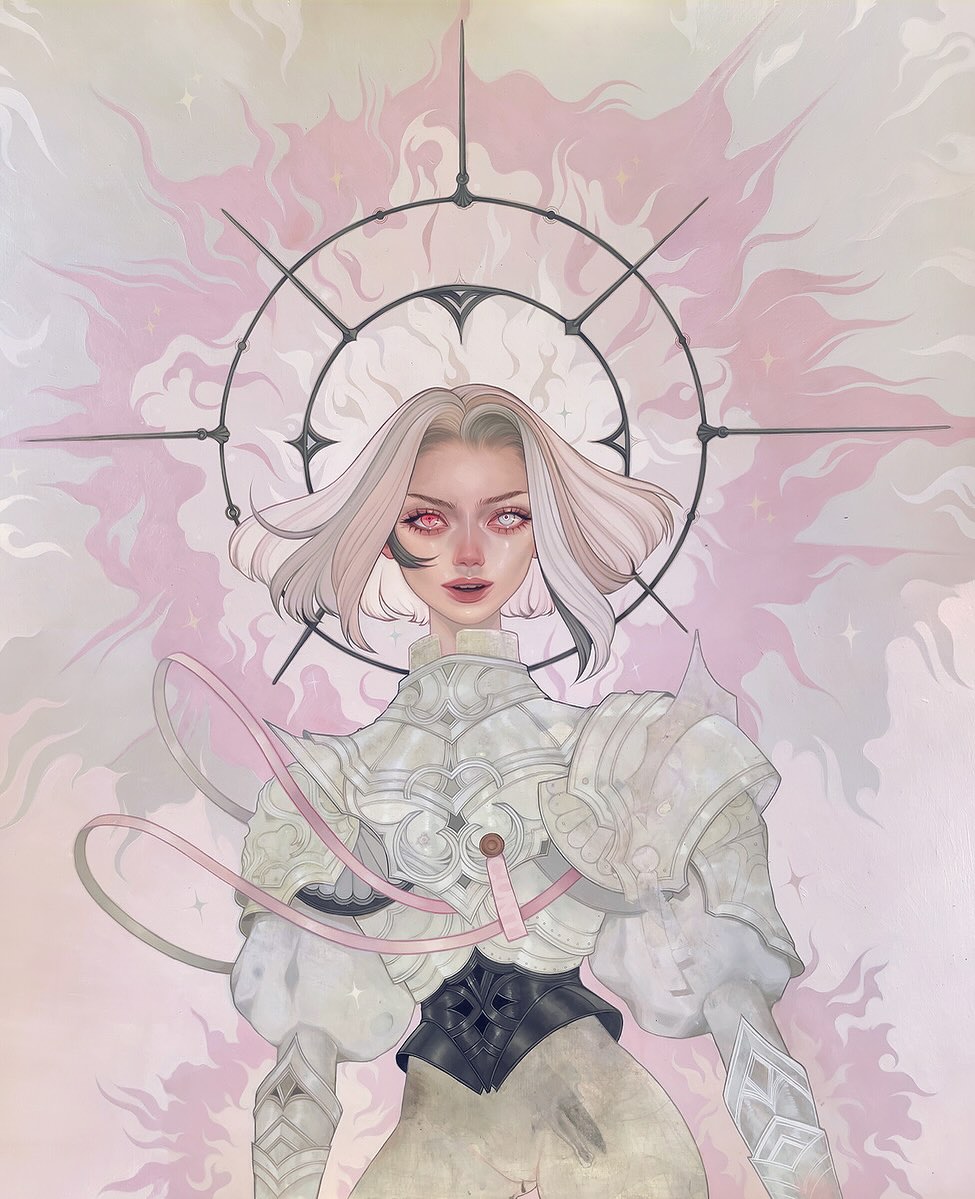 Beckett's oeuvre centers on depictions of women adorned in intricately detailed attire, characterized by an abundance of intricate drapery, layers, and patterns, often embellished with floral elements. She demonstrates a distinct style in her portrayal of faces, where the restrained modeling around the edges and features lends a graphical appeal that is both charming and engaging.