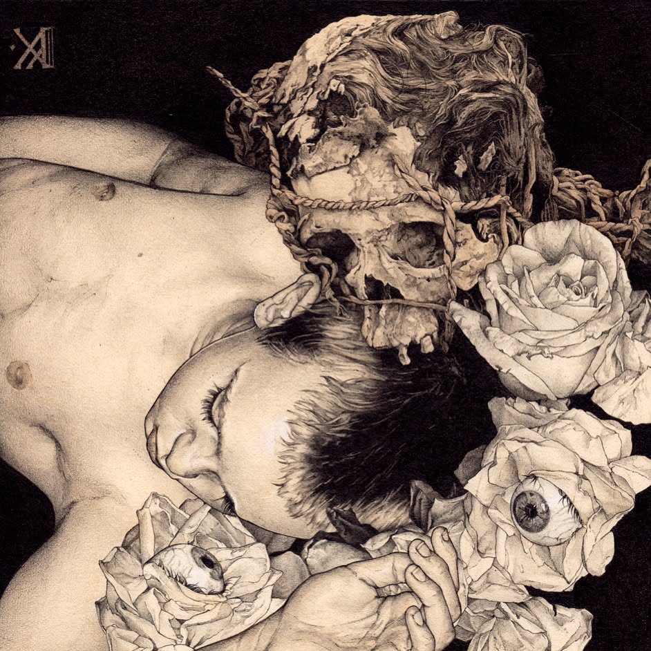 Kikyz1313 (b. 1988, Querétaro, Mexico) creates exquisitely detailed works on paper using ink, graphite, and watercolor. At first glance, her compositions appear delicate and restrained, drawing the viewer in with their quiet precision. Yet beneath this surface unfolds a far more complex and unsettling world, where beauty and discomfort exist in constant tension.