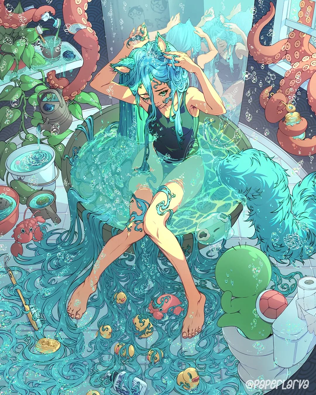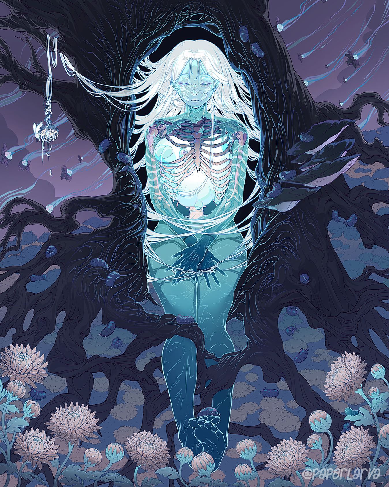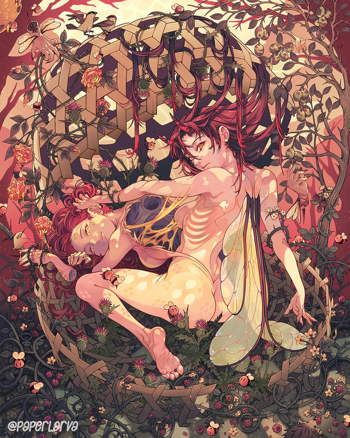 Blending pop-cultural nostalgia with personal symbolism, Paperlarva’s work explores intimacy, memory, and the quiet emotional undercurrents of growing up between worlds. Their figures often inhabit soft, symbolic spaces where innocence meets melancholy and sweetness brushes against strangeness. Through delicate linework and narrative subtlety, Scarlet and Jessen construct a shared mythology—one rooted in partnership, cultural hybridity, and the lingering magic of formative influences.