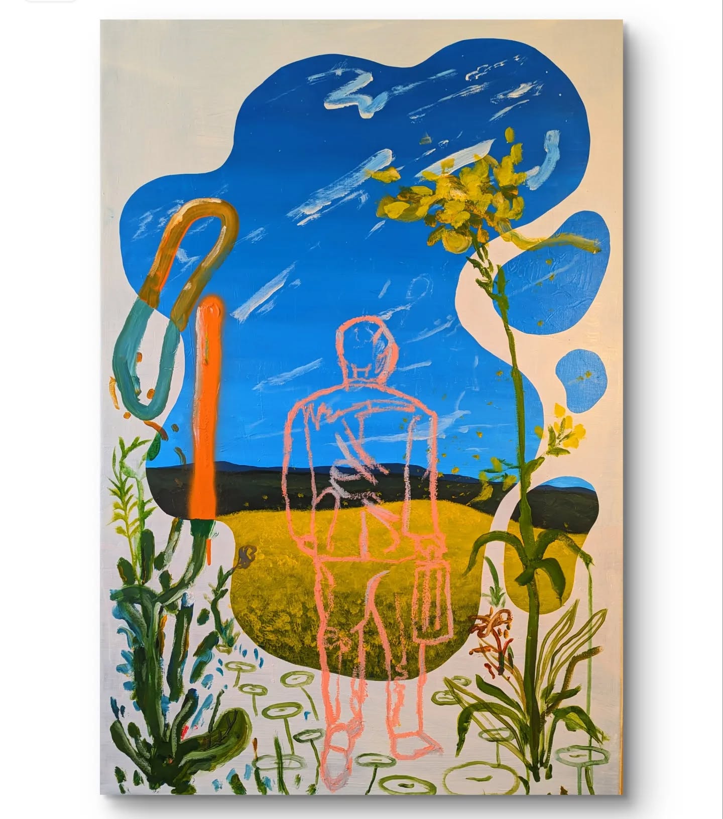 Born in 1998 in Saint-Pierre, La Réunion, Téo Gueguin-Caillaud, known as Tehow, is a self-taught artist now based in Nantes, France. Working beyond academic traditions, he has developed a hybrid visual language that blends painting, drawing, collage, and writing. His practice moves fluidly across surfaces—wood, canvas, and paper—guided by intuition and subject matter.