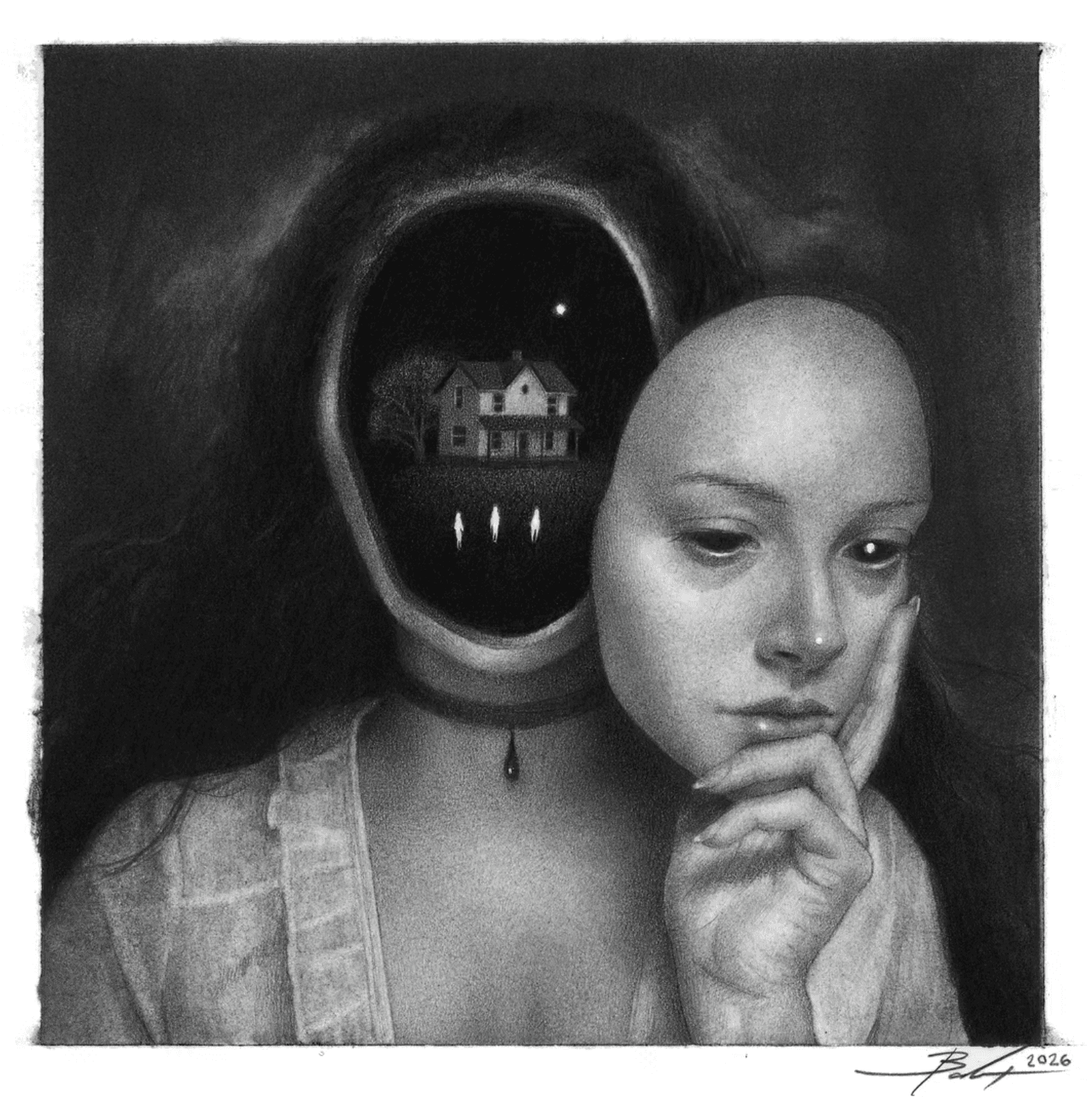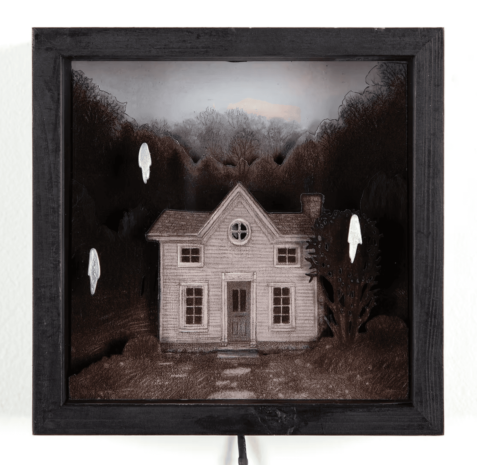 Five drawings and three light-up dimensional works, including a gorgeously constructed rare sculpture, form a gateway into the artist’s dark and ethereal inner world. Harrowing and complex, Babs’ symbolic images float like memories moving in and out of view.