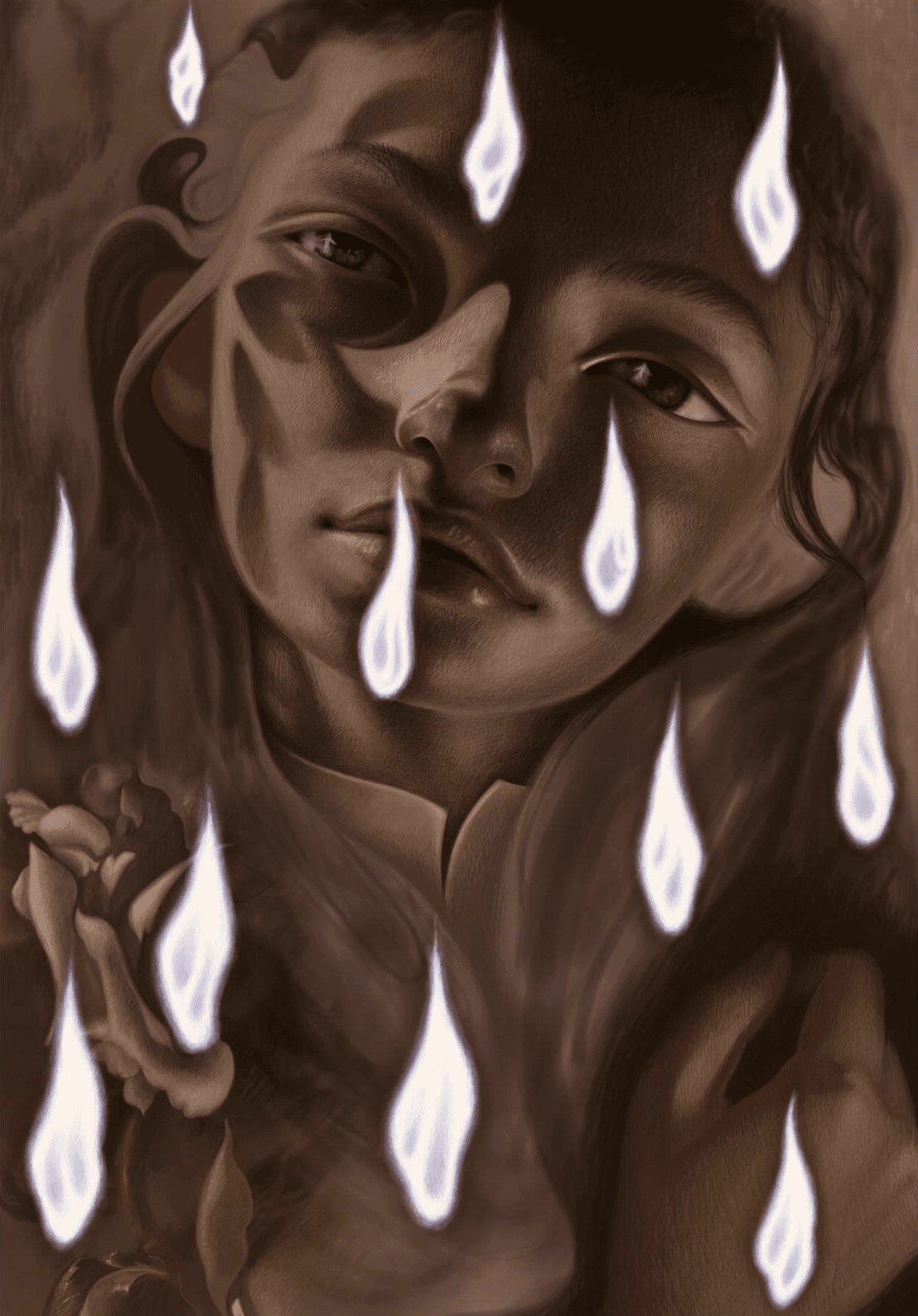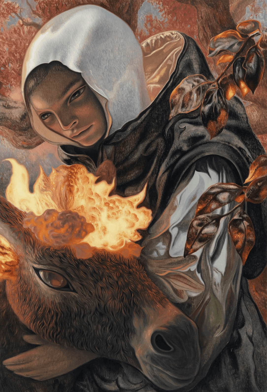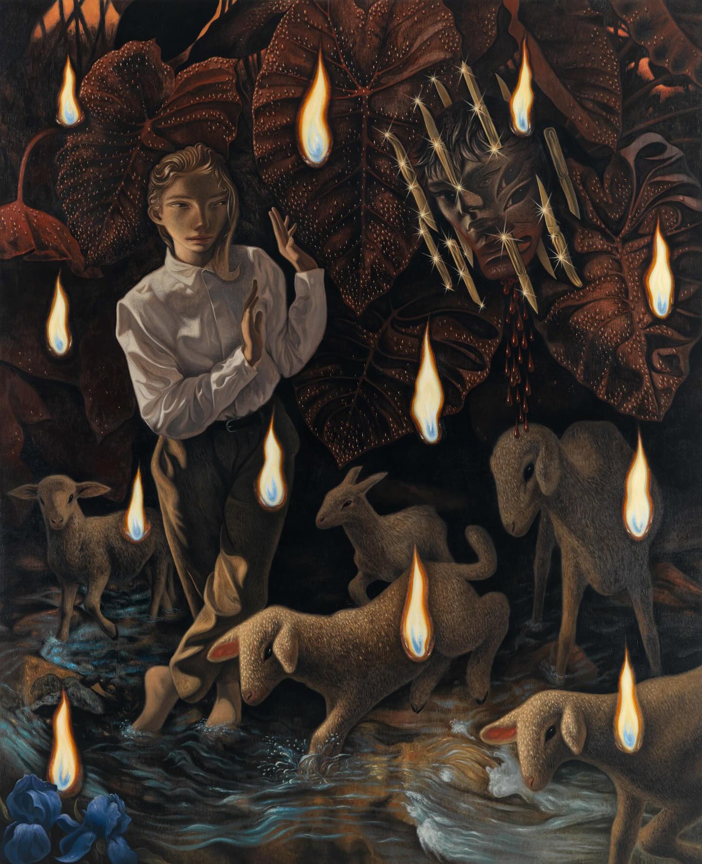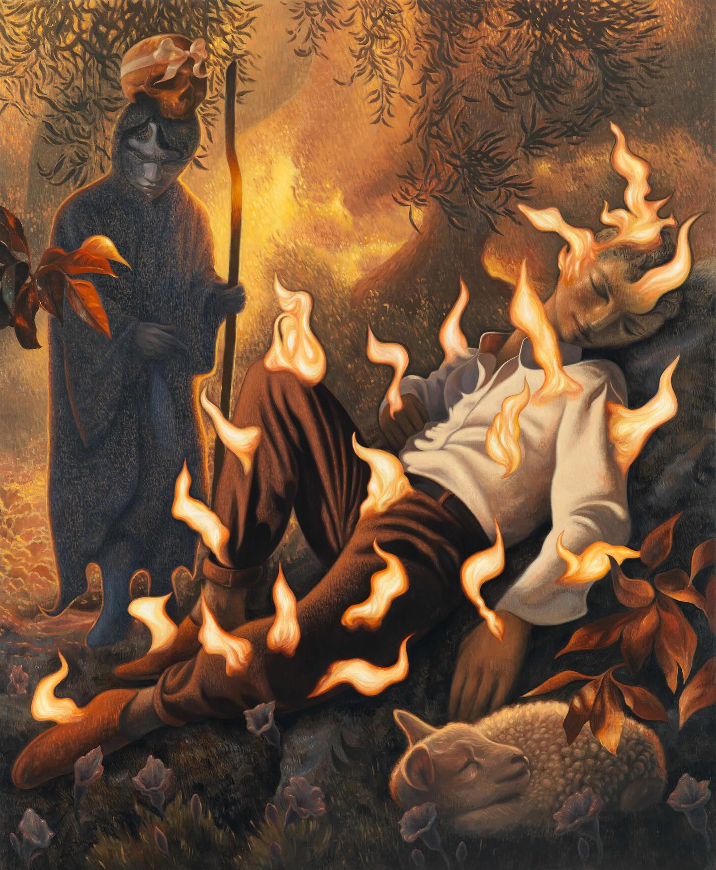 Scholl constructs his works like visual collages, weaving together fragmented figures, organic forms, and unexpected materials into intricate compositions meant to be explored slowly. His characters, who are strange, humorous, and deeply expressive, inhabit dreamlike environments where human forms blend seamlessly with nature lit by fire like spectres.