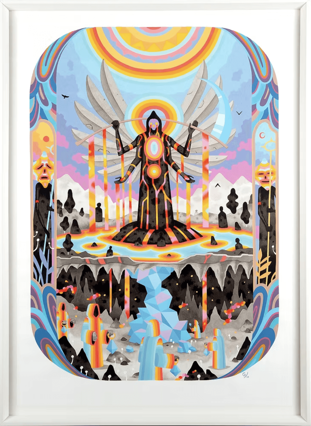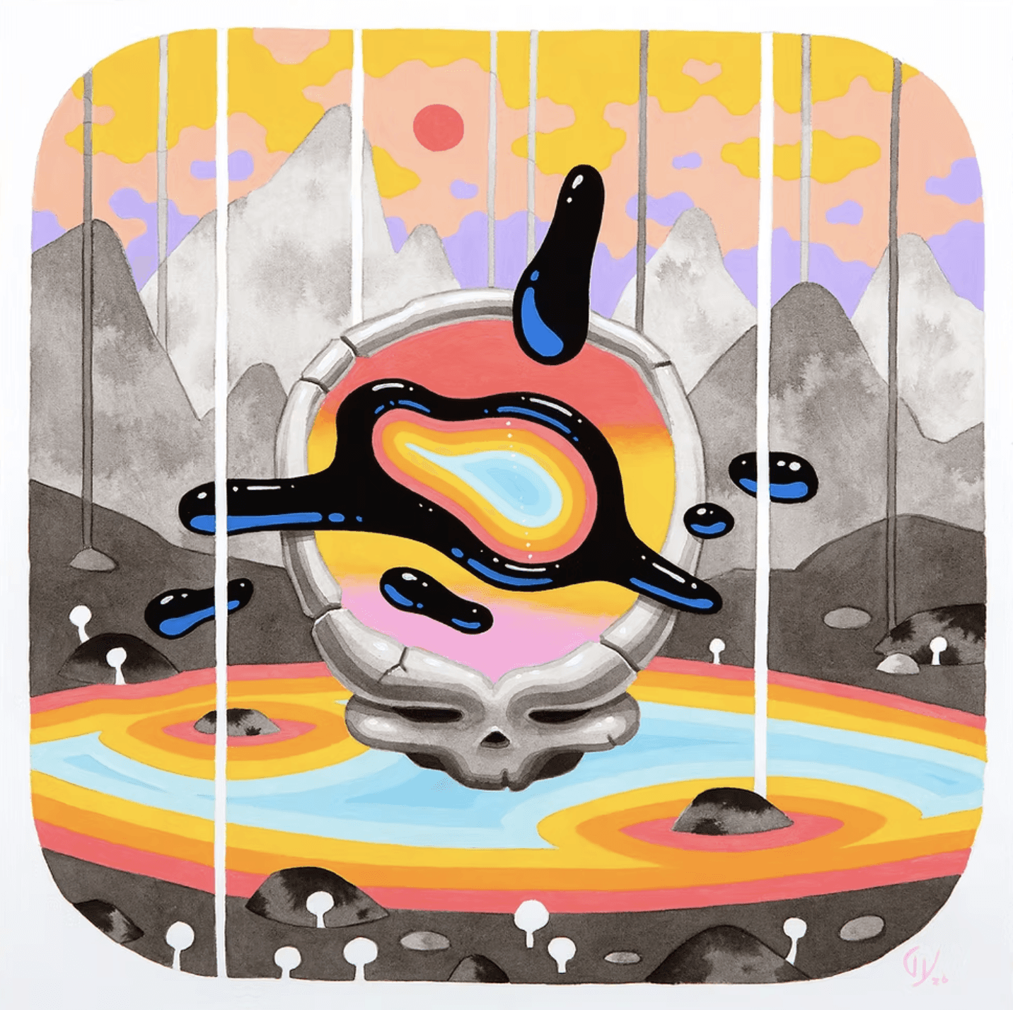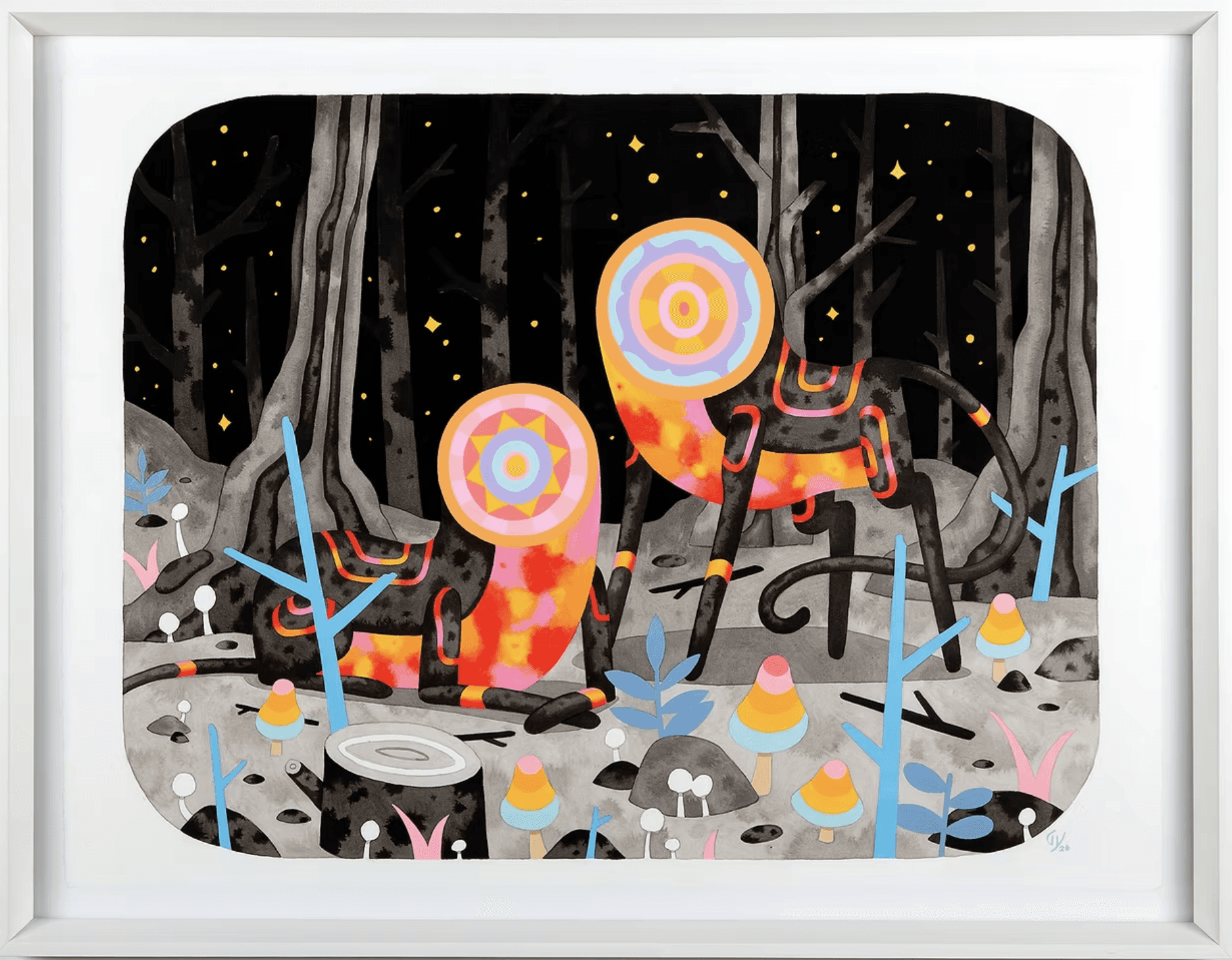 "The Cherished Unknown" is a series of seven new paintings by Graham Yarrington that forge a psychedelic sci-fi fantasy world, where four-legged beasts, totems, and shrouded protectors pour forth with strange benevolence. There’s something intoxicating and effortless about Graham’s illustrative style. His juxtaposition of water-based techniques—opaque shapes and brilliant linework make colors leap from blooming gradations of black ink—like neon sprouting from ash. Swirling, gathering, mounting, and growing, Yarrington’s creatures breathe life into the dark, apocalyptic world they occupy, transporting us as vibrations of light and otherworldly glow.