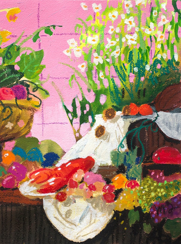 Divided into two dominant complementary color groups, red and green, the works are installed in two separate rooms. Moving from one space to the other heightens the visual experience, echoing the emotional shift. The works are filled with intimate details: burned-down candles, untouched fruit, fallen glasses, oversized bouquets with no one left to admire them.