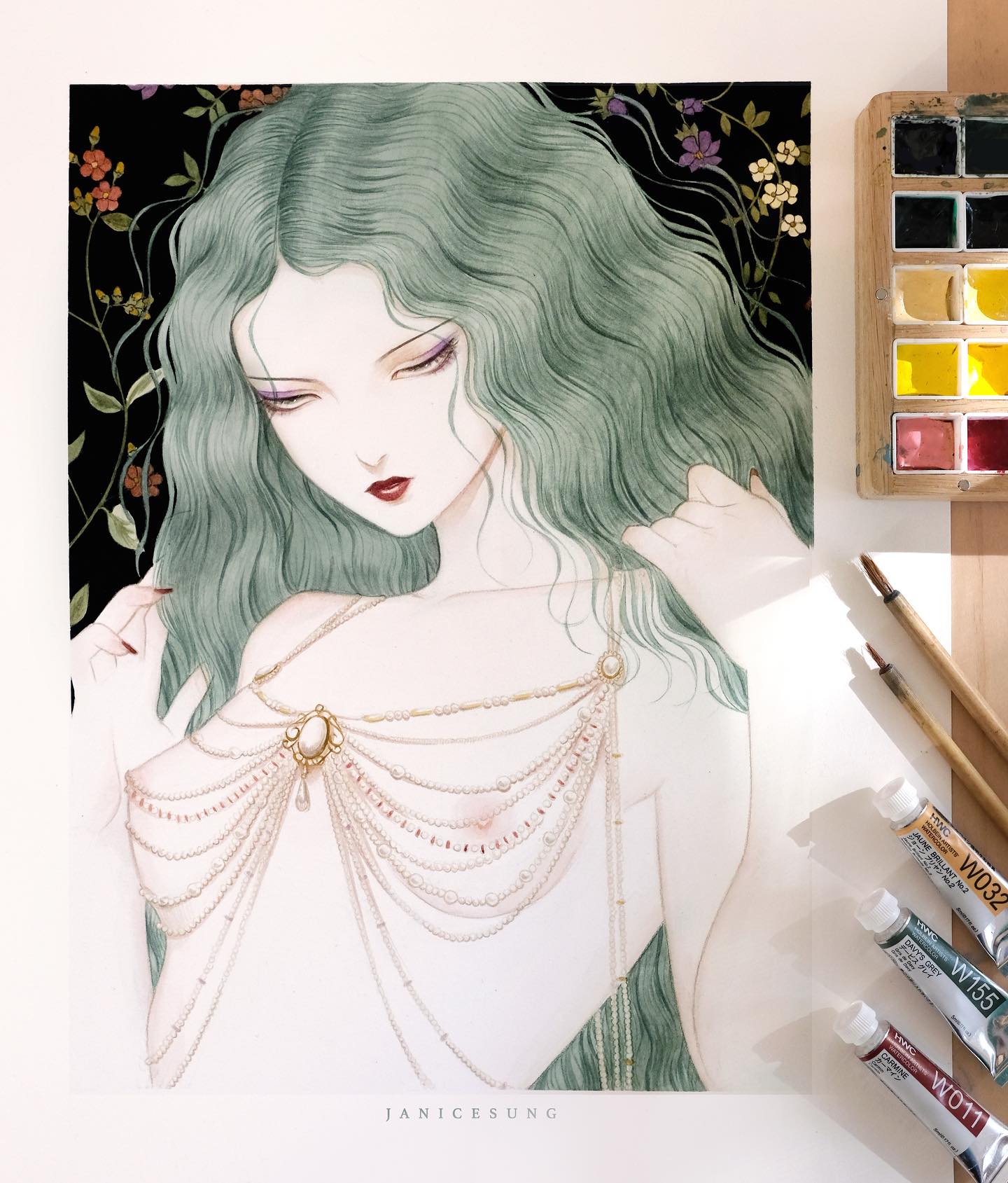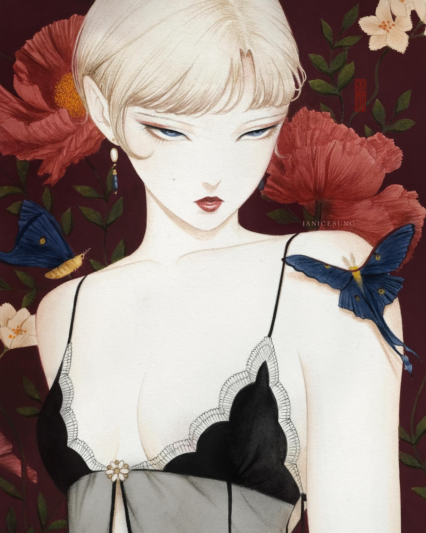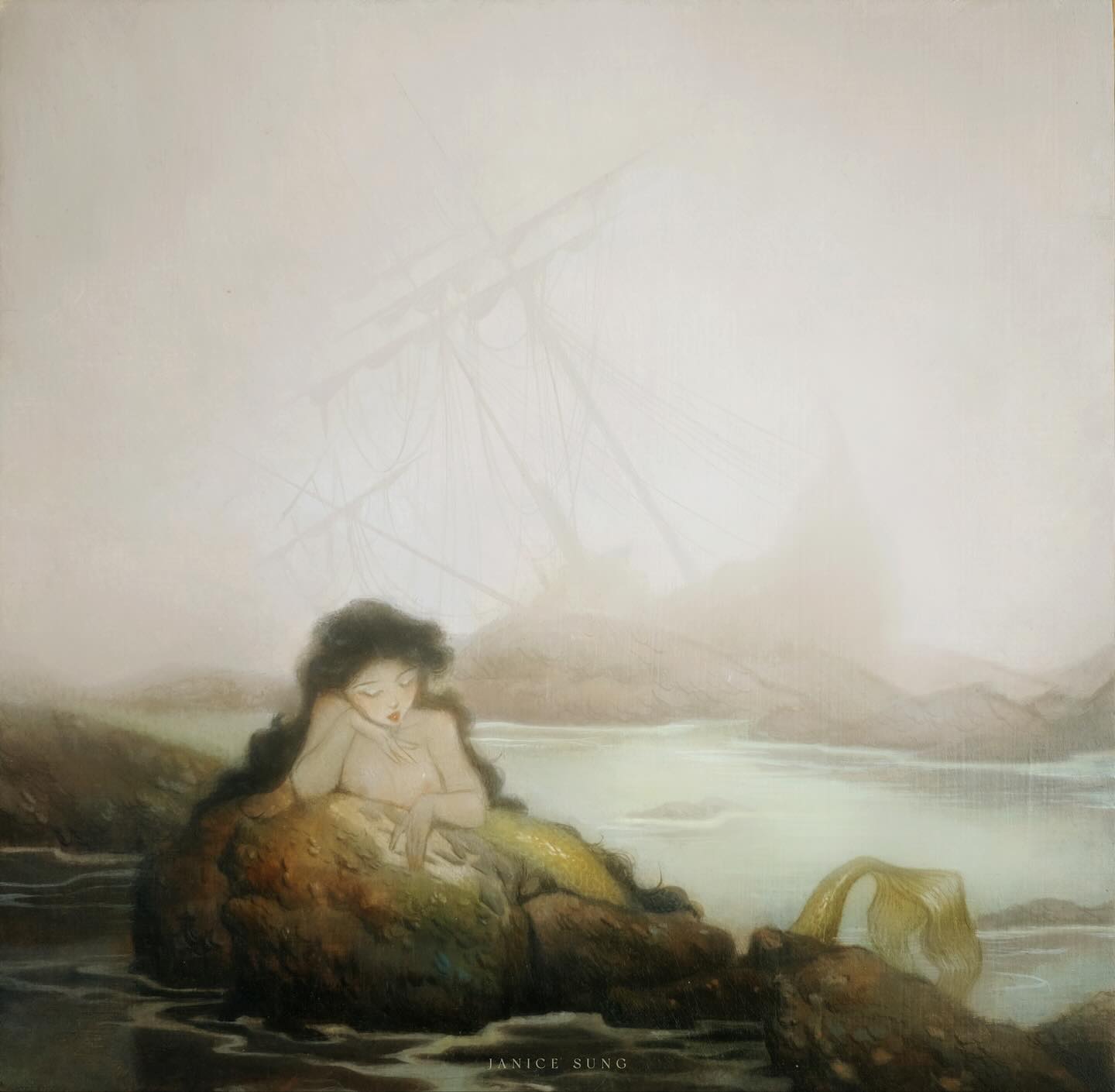 Sung’s work centers on the feminine spirit, depicting quiet, introspective figures entwined with flora and fauna. Drawing on influences from Baroque painting, Japanese art, and mythological and gothic traditions, her imagery weaves together themes of melancholy, romance, and quiet enchantment. Working across watercolor, gouache, oils, acrylic, and digital media, Sung creates ethereal, dreamlike worlds that feel both timeless and intimate.