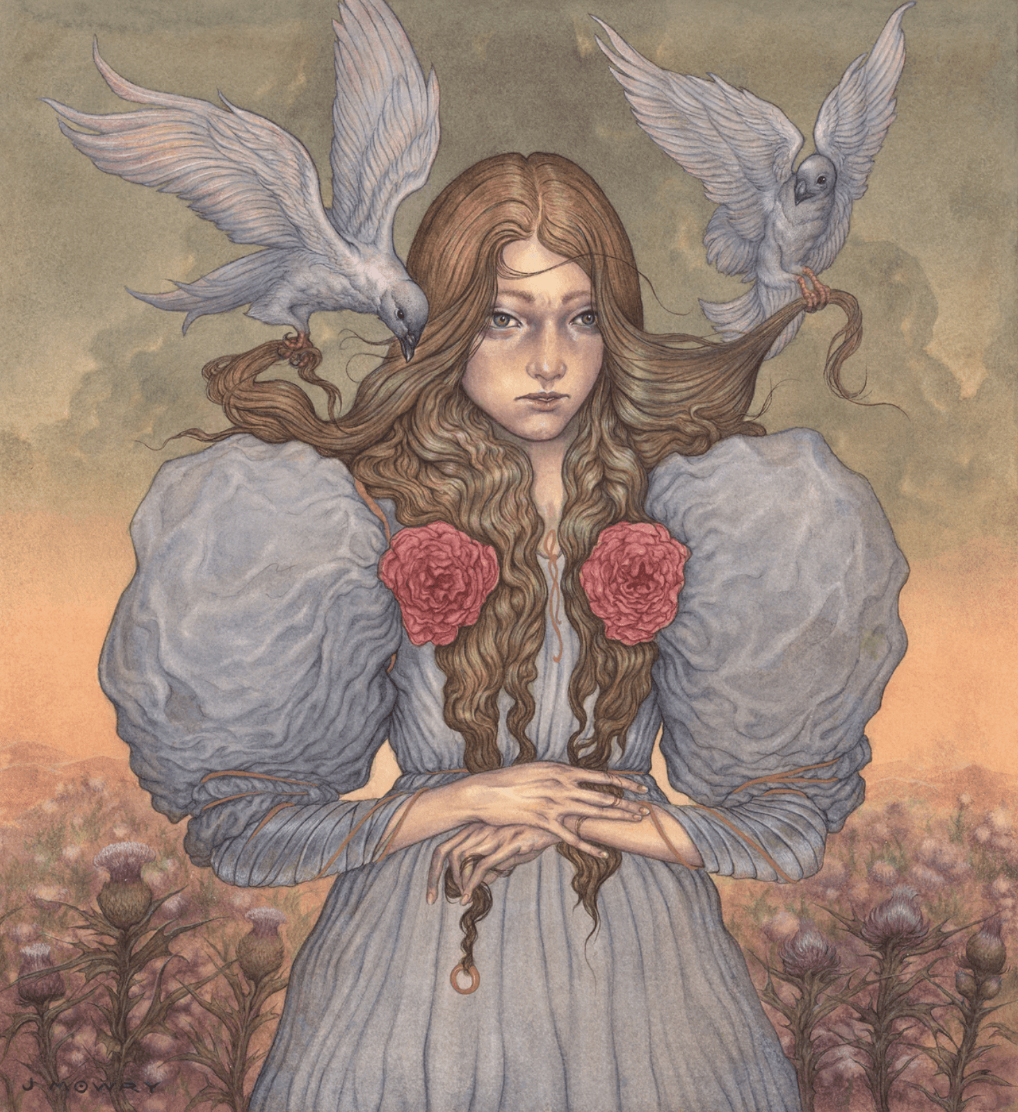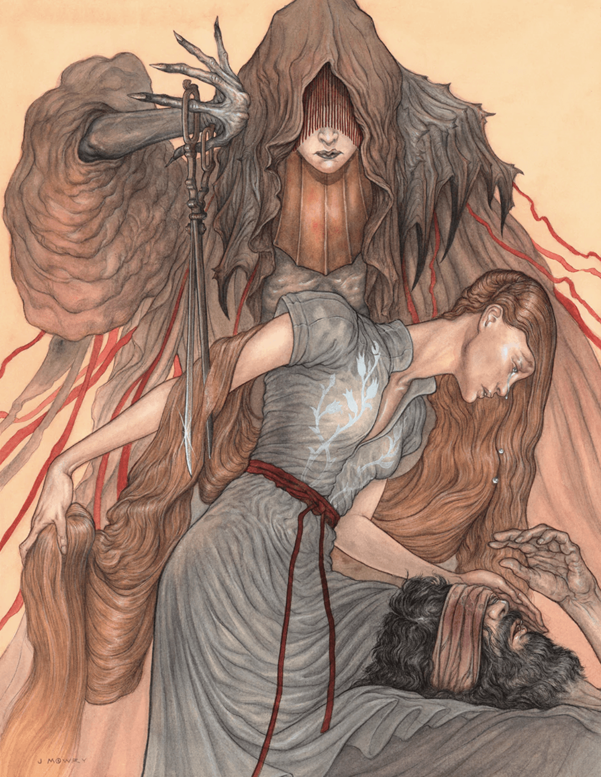 Mowry's work blends expressive figurative imagery, archetypal insights, personal narratives, and illustrative techniques to engage with a human story. Jason grew up between the local art museum and comic book shops, combining the rhythms of each walking the line between formal art and the fantastic space. His art is exhibited nationwide and internationally in many fine galleries. In 2022, Jason Illustrated Grimm's Fairy Tales for Easton Press. He calls Ohio home, where he keeps a studio and teaches at a local art college. When he is not in the studio, wandering the nature preserve near his home.