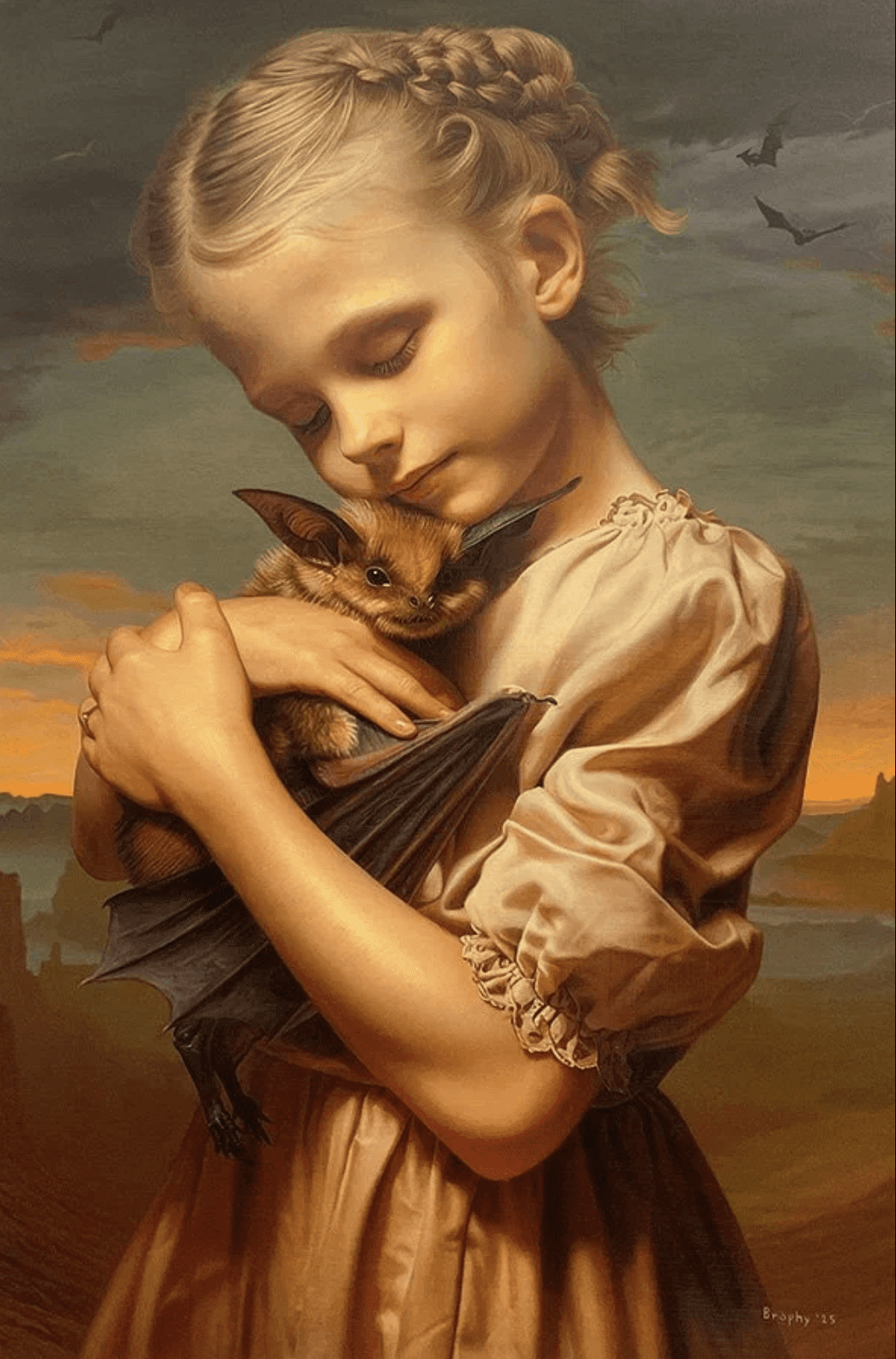 Brophy's unusual painting style is due to his highly labor intensive creation process. Each work is first digitally rendered in a 3d modeling program by Brophy - with every detail added, arranged and lit inside the program. Once Brophy is satisfied with the image, he then uses that as a guide to completely recreate the image by hand in oil paint on panel, often making his own oil paints and finishes from scratch. His strict adherence to recreating the digital image creates a strange discordance- a sense of "uncanny valley"- we obviously know the "characters" portrayed but cause us to question what we really know about them, what is real and what is projected by the viewer.