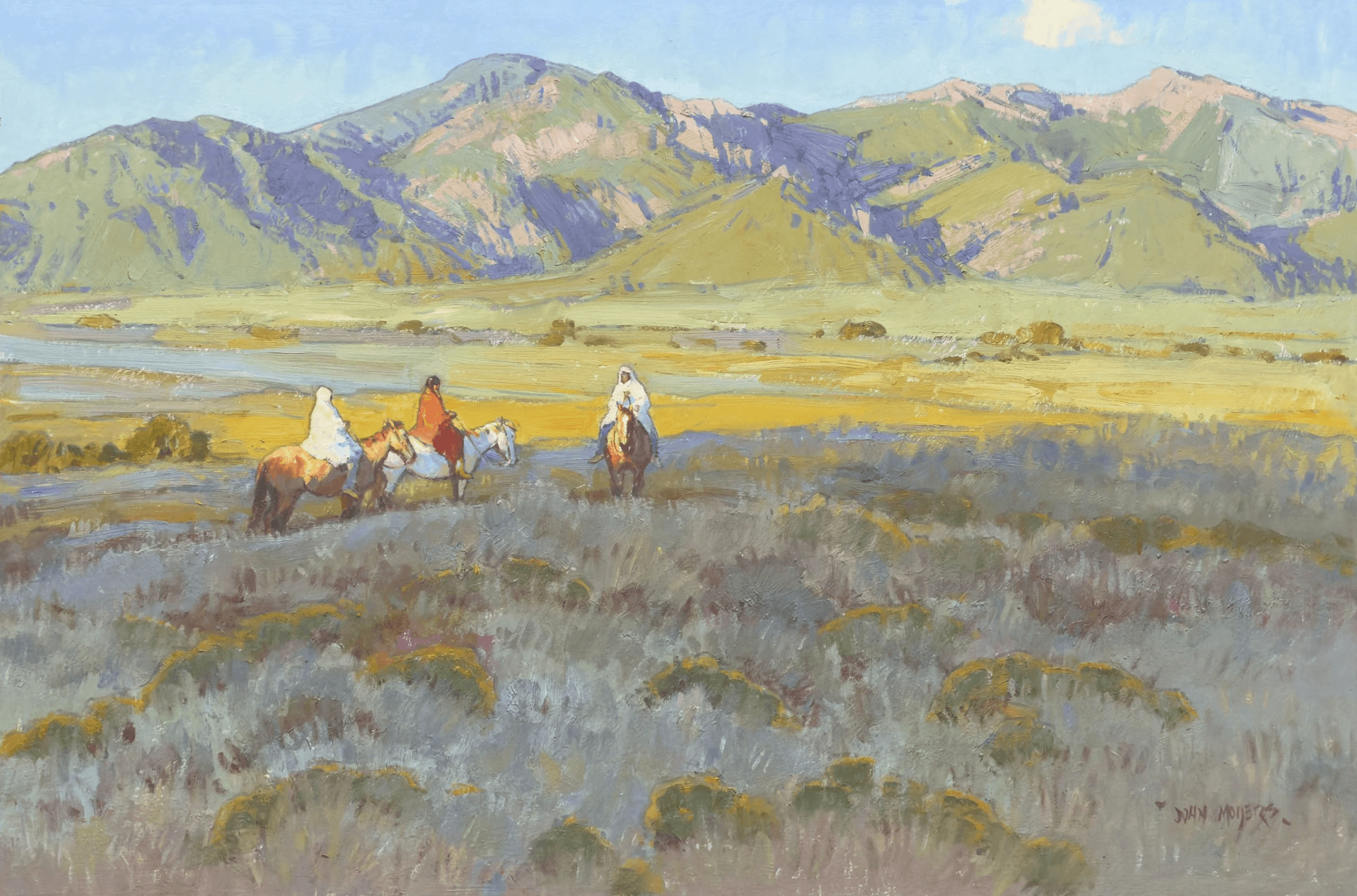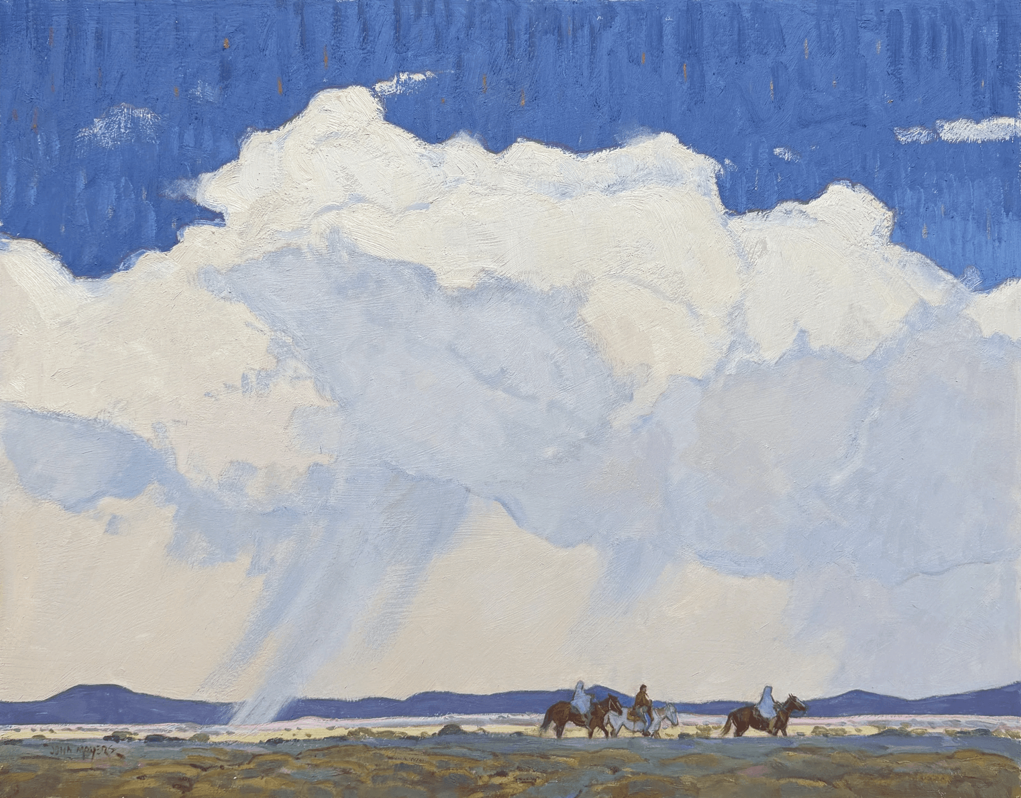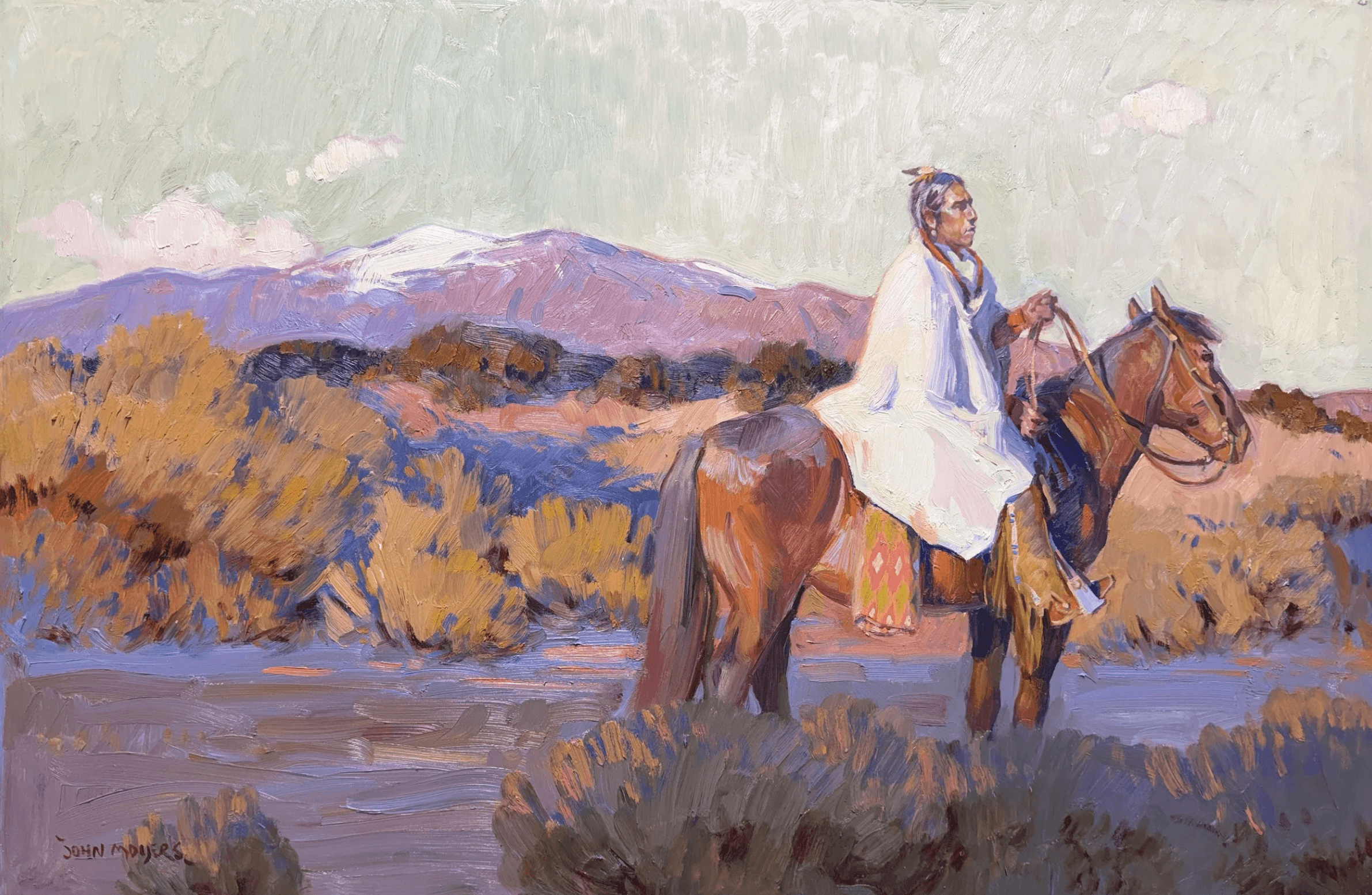 Moyers, raised in Albuquerque, New Mexico, is the son of Cowboy Artists of America painter William Moyers and developed his artistic path surrounded by art. After studying in California, a pivotal 1979 workshop in British Columbia deepened his commitment to plein air painting and shaped his approach to capturing the light and wonder of western wildlife and landscape. Since then, he has built a distinguished career, earning recognition at major Western art exhibitions and serving as president of the Cowboy Artists of America. Known for painting Native American subjects, cowboys, and Southwestern landscapes, Moyers continues to work alongside his wife, Terri, drawing inspiration from the American West and beyond.