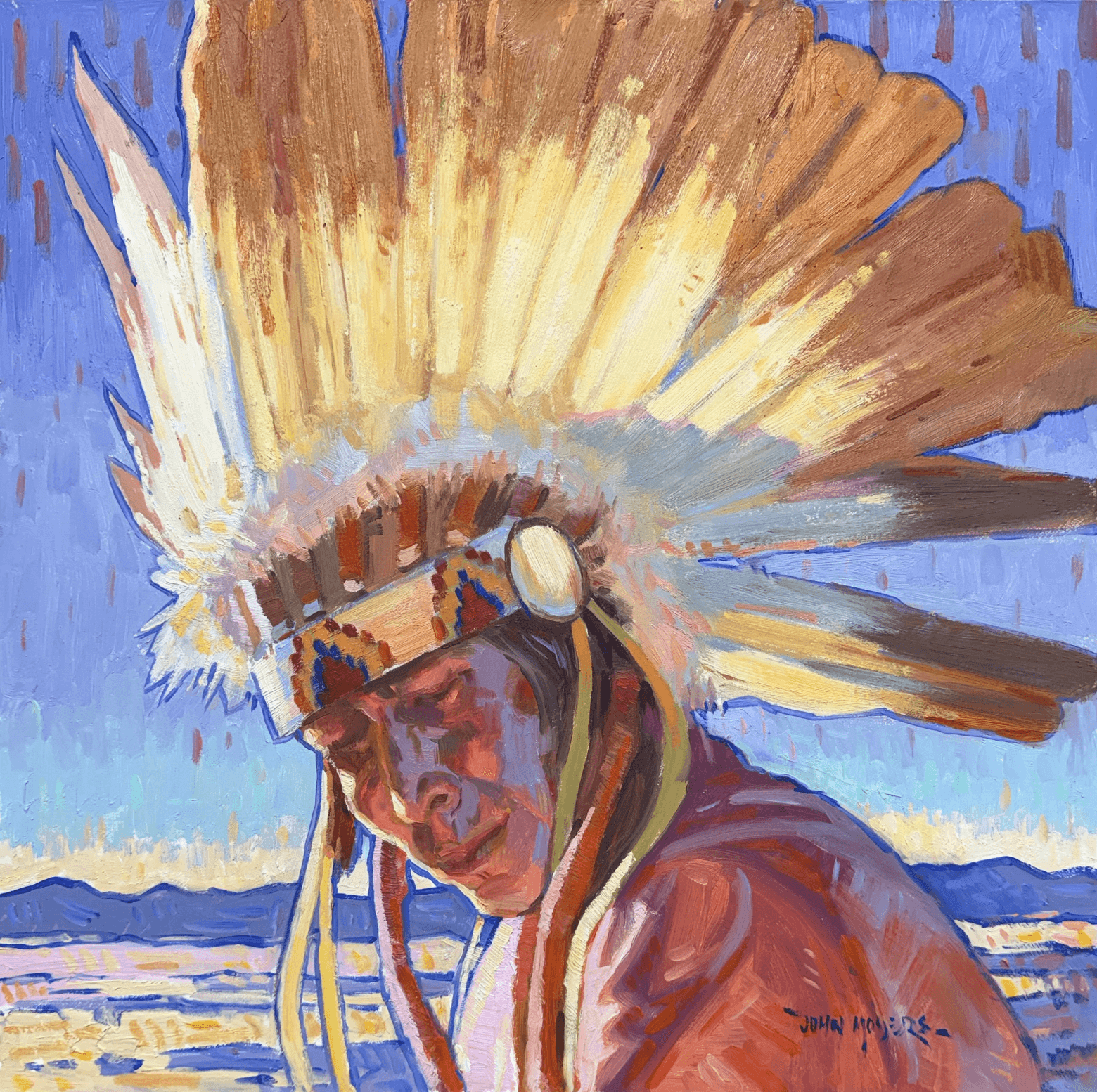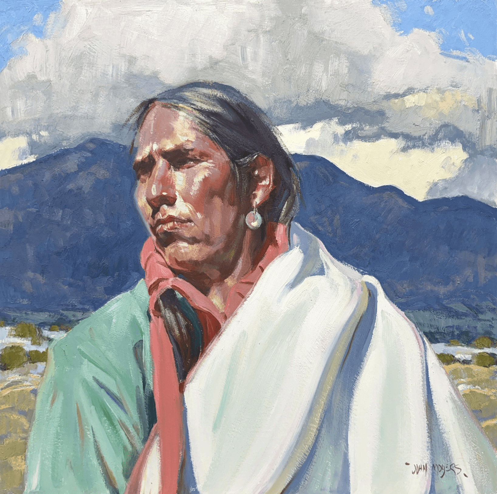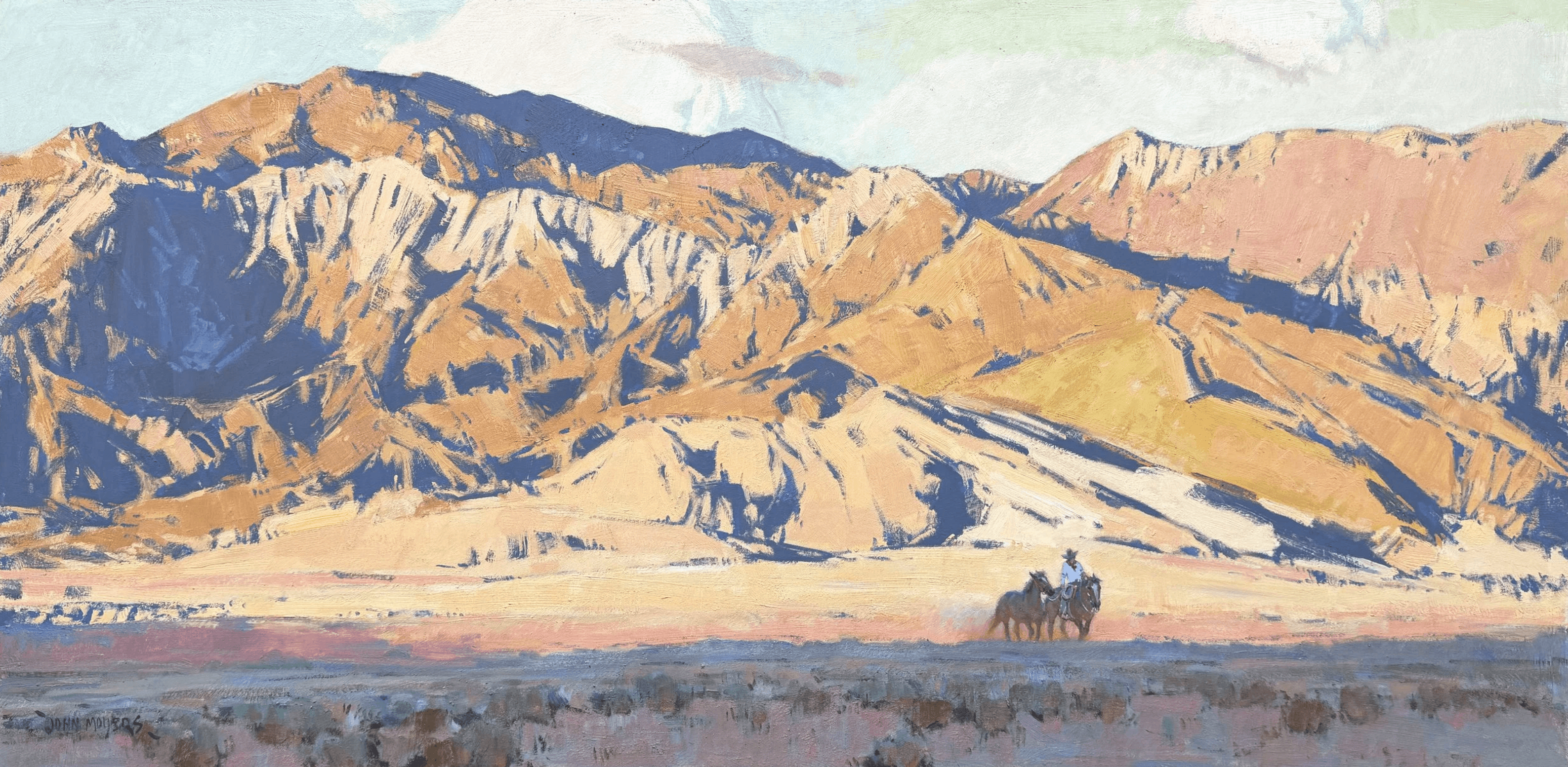Moyers, raised in Albuquerque, New Mexico, is the son of Cowboy Artists of America painter William Moyers and developed his artistic path surrounded by art. After studying in California, a pivotal 1979 workshop in British Columbia deepened his commitment to plein air painting and shaped his approach to capturing the light and wonder of western wildlife and landscape. Since then, he has built a distinguished career, earning recognition at major Western art exhibitions and serving as president of the Cowboy Artists of America. Known for painting Native American subjects, cowboys, and Southwestern landscapes, Moyers continues to work alongside his wife, Terri, drawing inspiration from the American West and beyond.