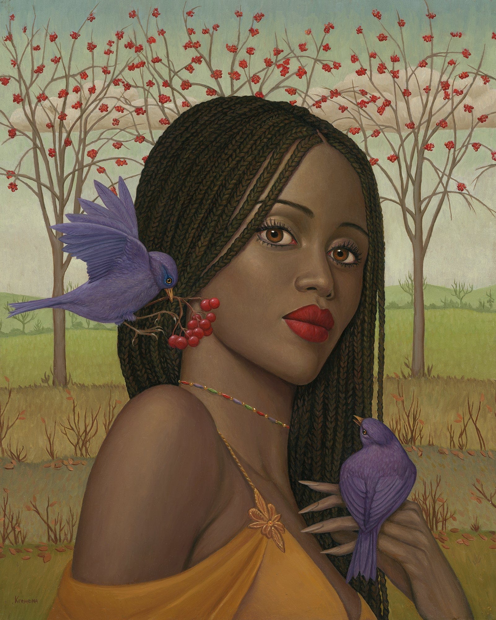 Kremena Chipilova is an award-winning contemporary oil painter born in Bulgaria and currently living and working in Finland. Known for her fantasy art and magical realism, her paintings suggest encounters with the supernatural and the unknown. Her figures (often women with wide-eyed gazes) possess an unknowable quality, striking a balance between eerie intensity and ethereal softness. Drawing inspiration from nature, folklore, myths, and fairy tales, Chipilova channels personal experience and literary influence into evocative and disquiet imagery.