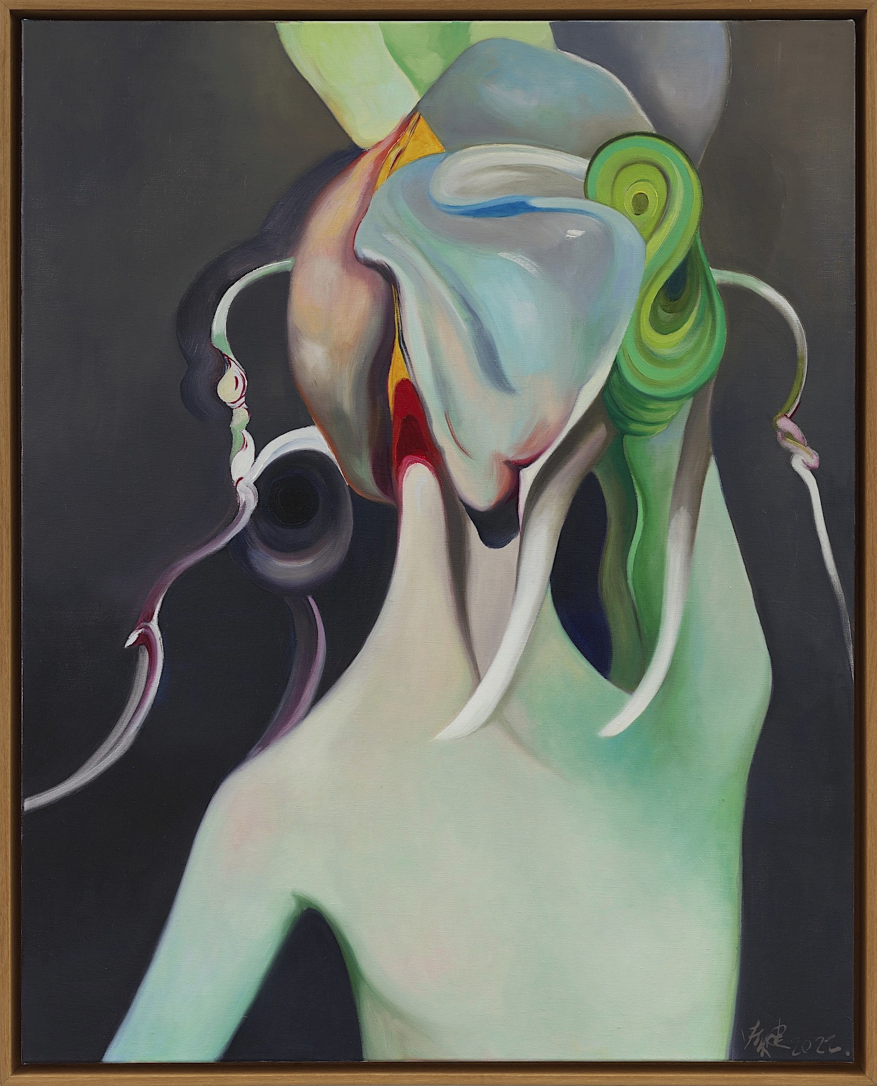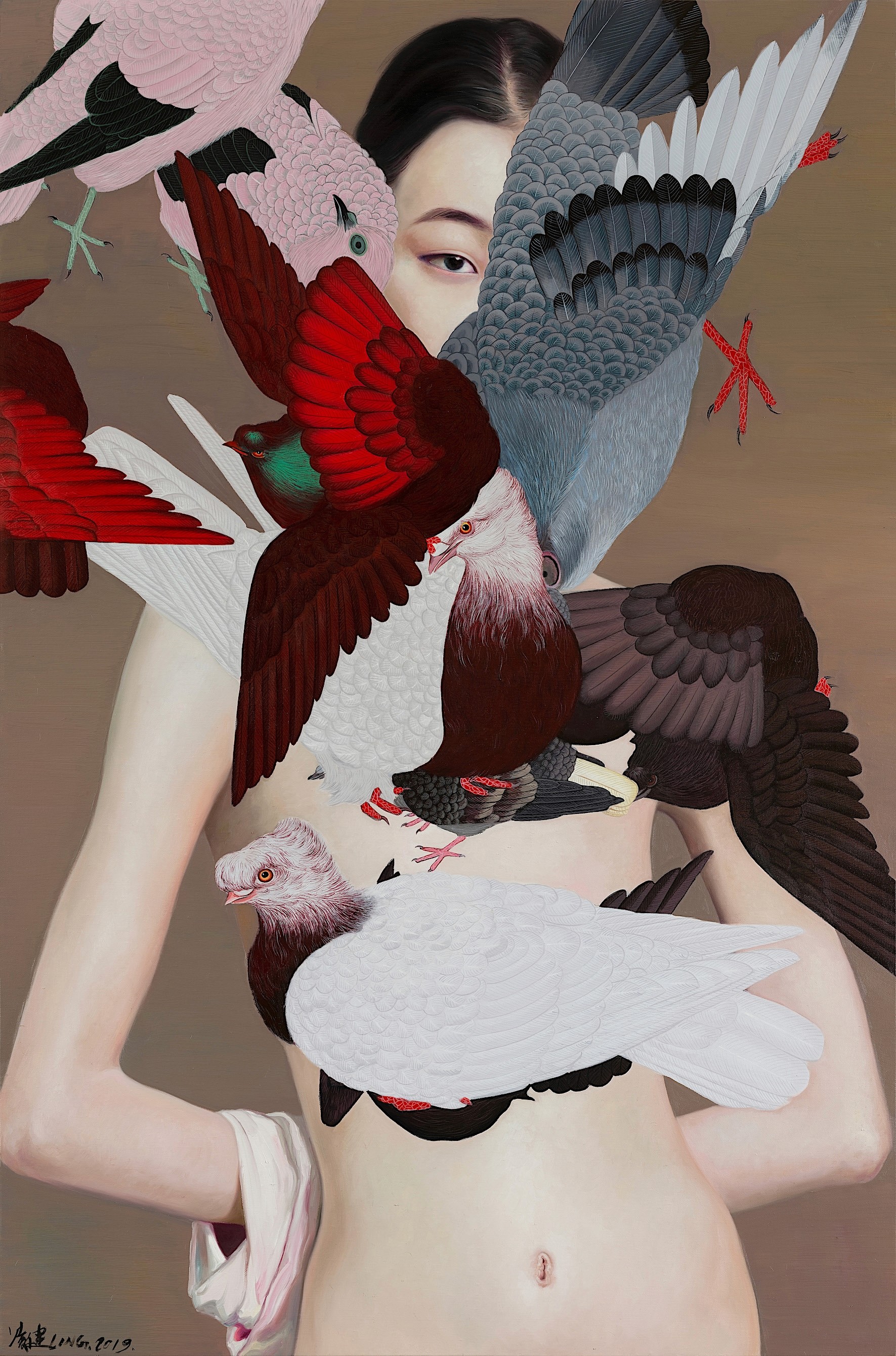 Ling Jian’s fascination with surrealism was embedded in previous hyperrealistic portraits. "Flying Gown" and "Genetic Recombination" extend Ling Jian’s exploration of beauty and mortality to the constructed image of the feminine. Merging the precision of gongbi brushwork with Western realist portraiture, these imagined women, conceived as representations of Eastern beauty, reflect a meditation on illusion and representation. In "Flying Gown," the artist overlays a woman’s body with imagery drawn from bird paintings found in the Forbidden City, both obscuring and revealing the subject; "Genetic Recombination" folds historical archetypes into a contemporary female figure, a divine transformation and the manipulation of form itself. In these portraits, Ling turns the female body into a vessel for reflection on identity and illusion.