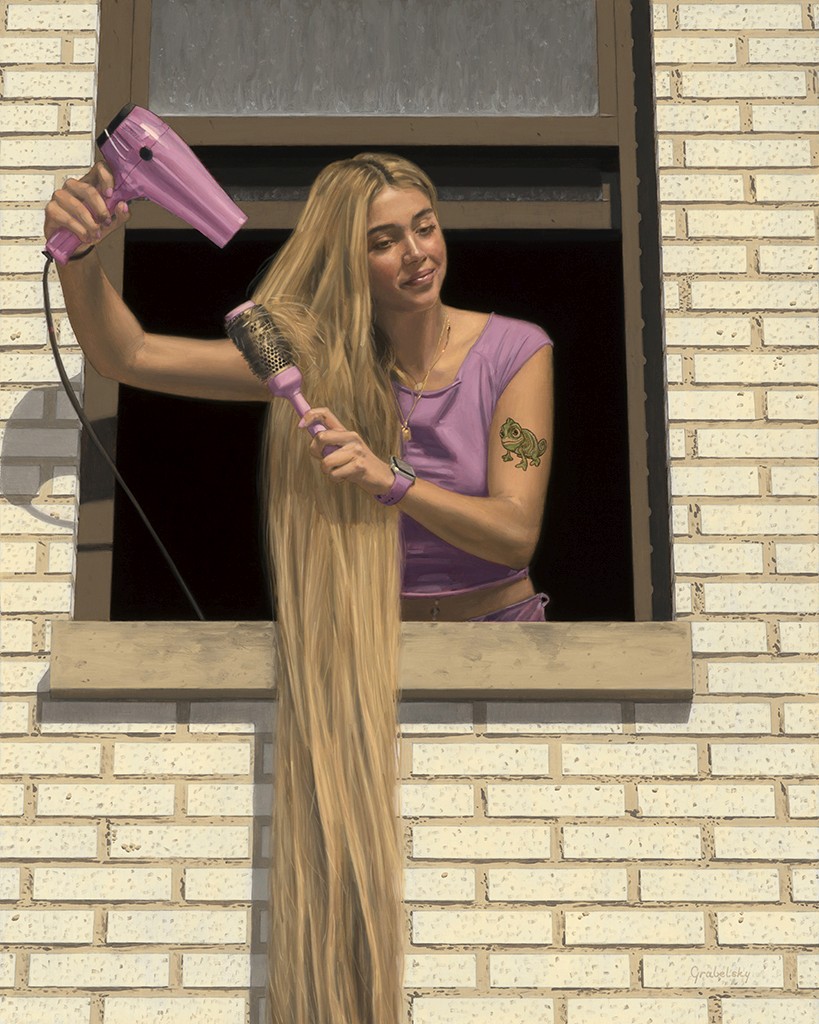 In his latest series, Grabelsky transports these beloved figures from their fairy-tale origins into present-day settings, asking viewers to reconsider who these women might be if encountered on the street today. While echoes of enchantment remain, these women are unmistakably contemporary. Each painting is infused with subtle visual clues that allude to the characters’ histories and origins.