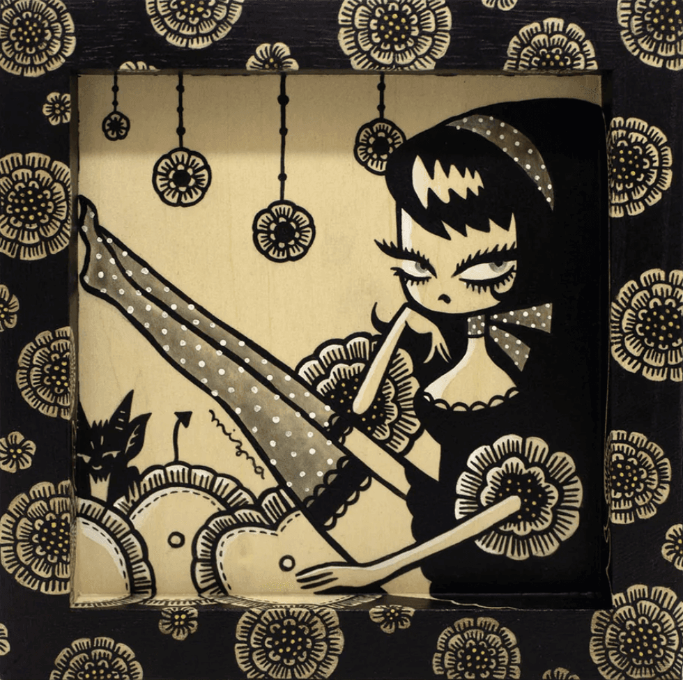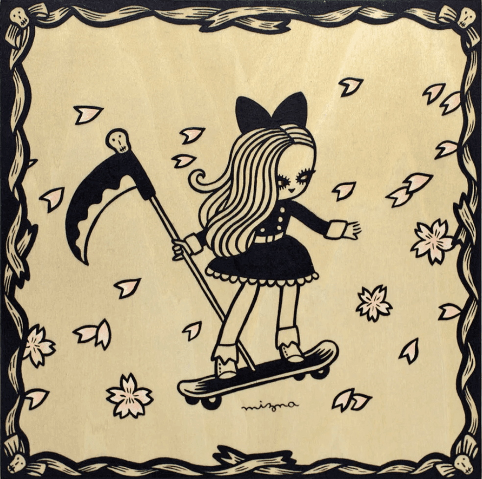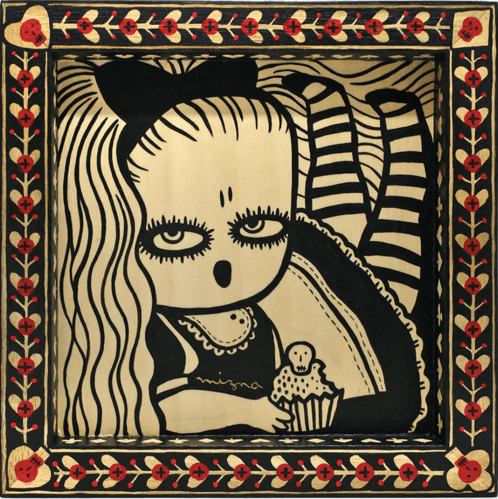 Mizna Wada is a Japan-based illustrator. She was born in 1974 in Kumamoto, Japan. She loves horror comics and horror movies from her childhood. Mizna creates creepy and cute girls by using various techniques: Drawing, Painting, Paper cutout, Print Gocco, and Dolls.