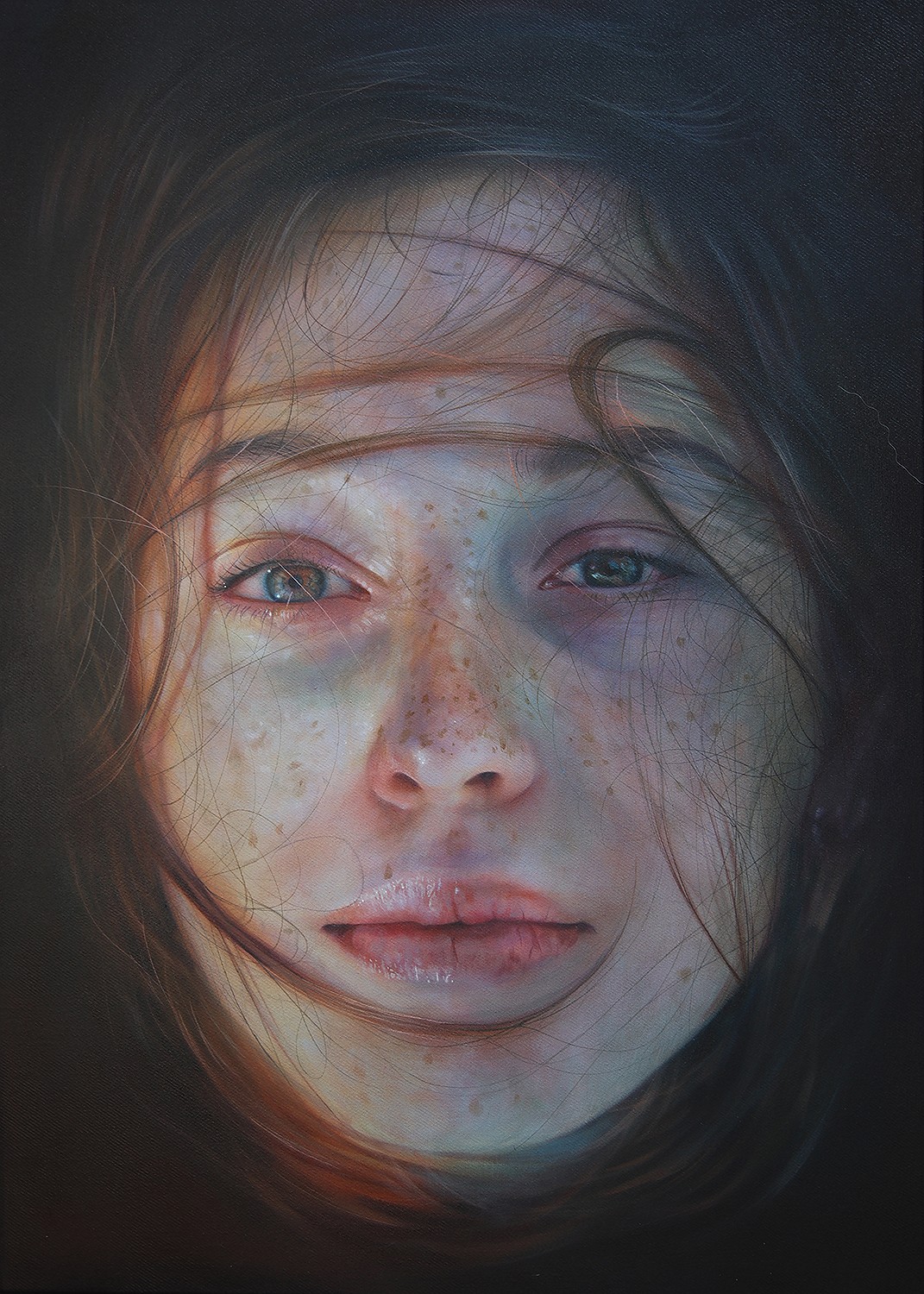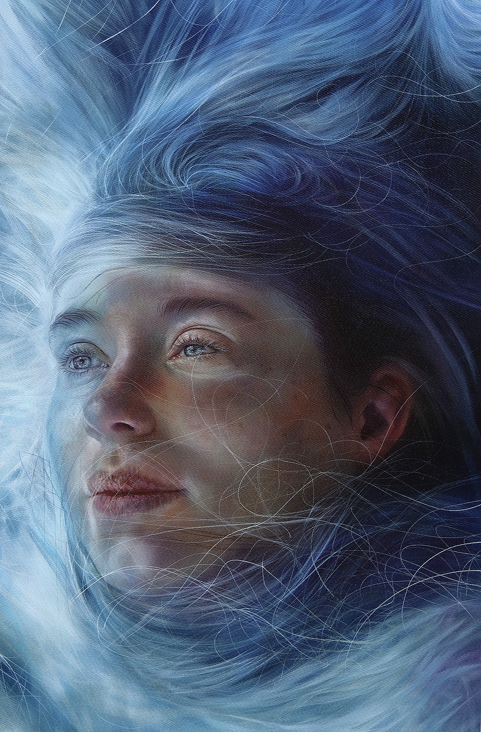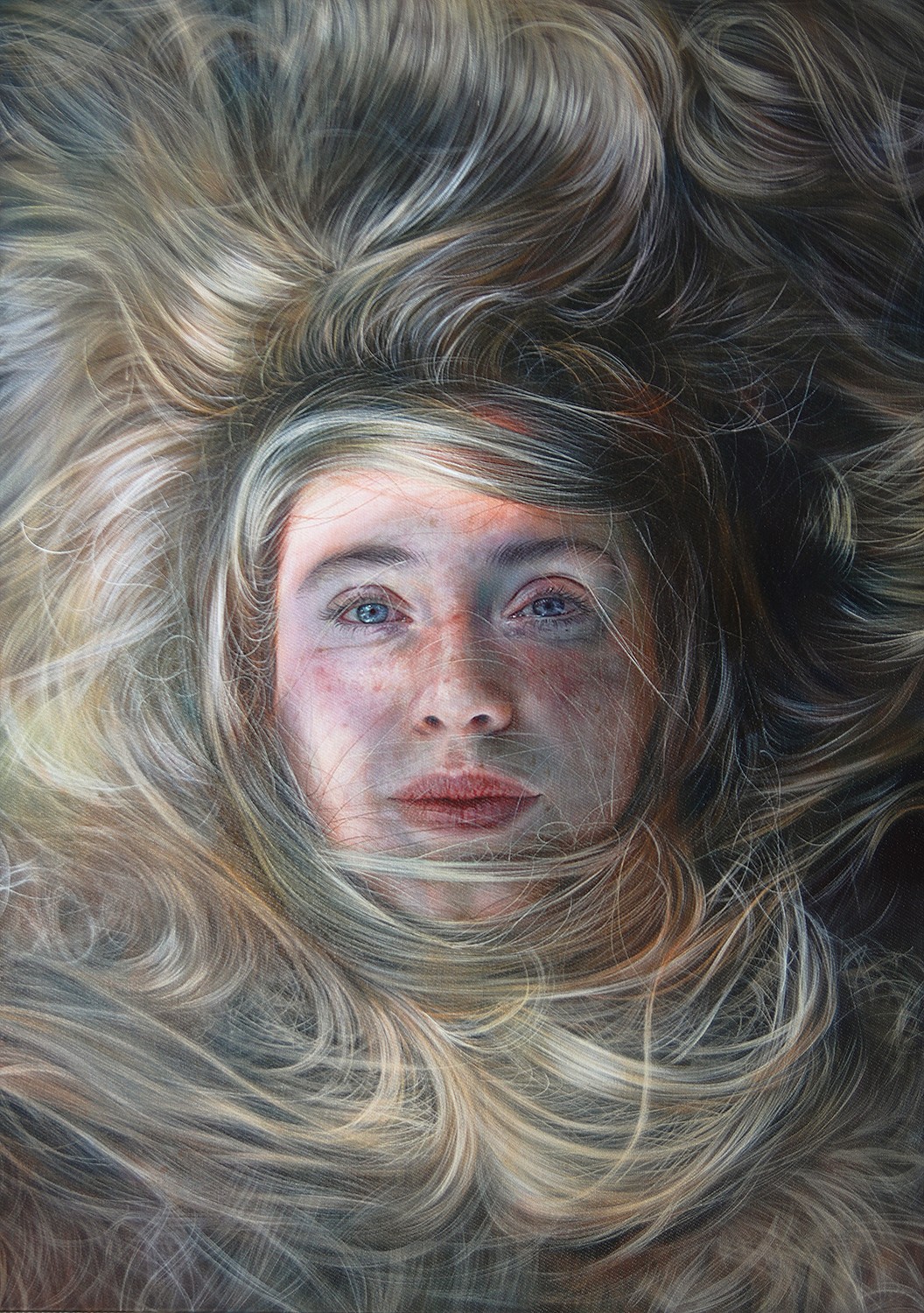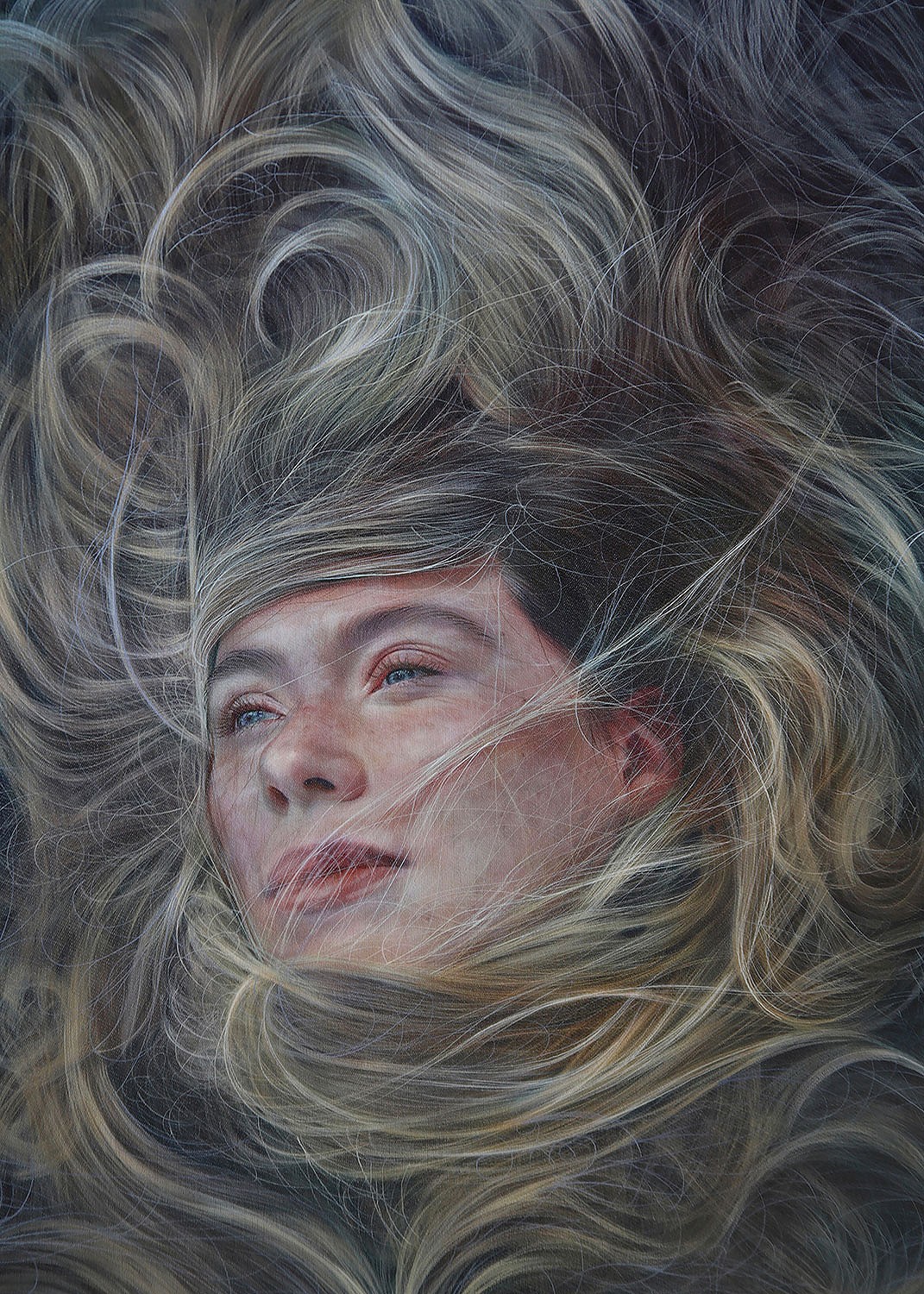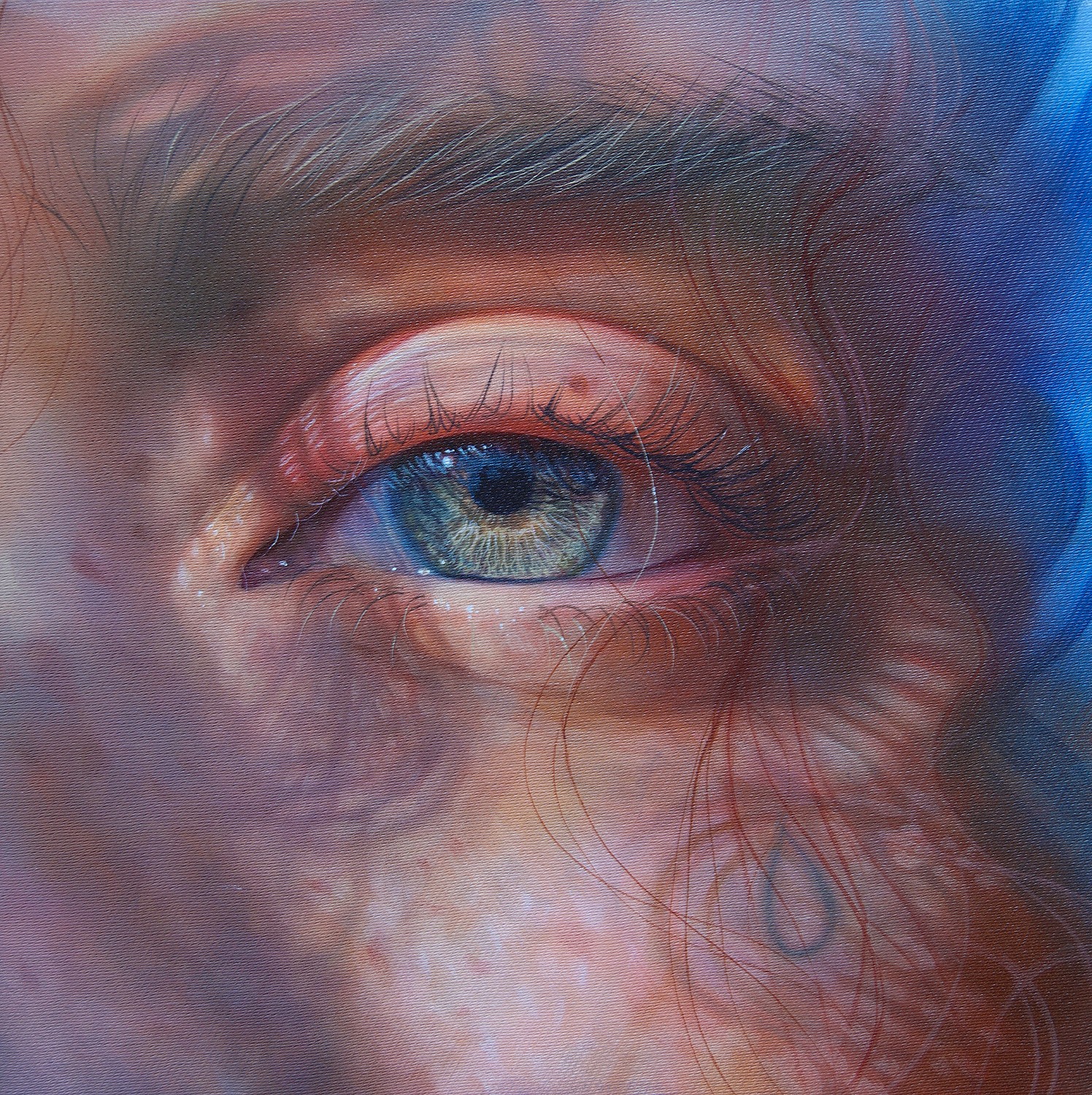 The women I paint, whether friends, strangers or myself, are not performing. They’re present and quiet. In a state of non-doing, unapologetic. They’re here, and you, the viewer, are allowed to be here too. Painting hair is part of that. It’s something I return to over and over again, almost obsessively. The repetition calms me. But it also connects me to something larger. In the flow and layering of hair, I see the same organic rhythms that appear in rivers, branches, lightning, and galaxies, fractal patterns that echo throughout nature and the cosmos. I see those same patterns in the eyes I paint. When you look closely into an iris, it’s like staring into a galaxy. The same structures, the same mystery. That’s what draws me in.