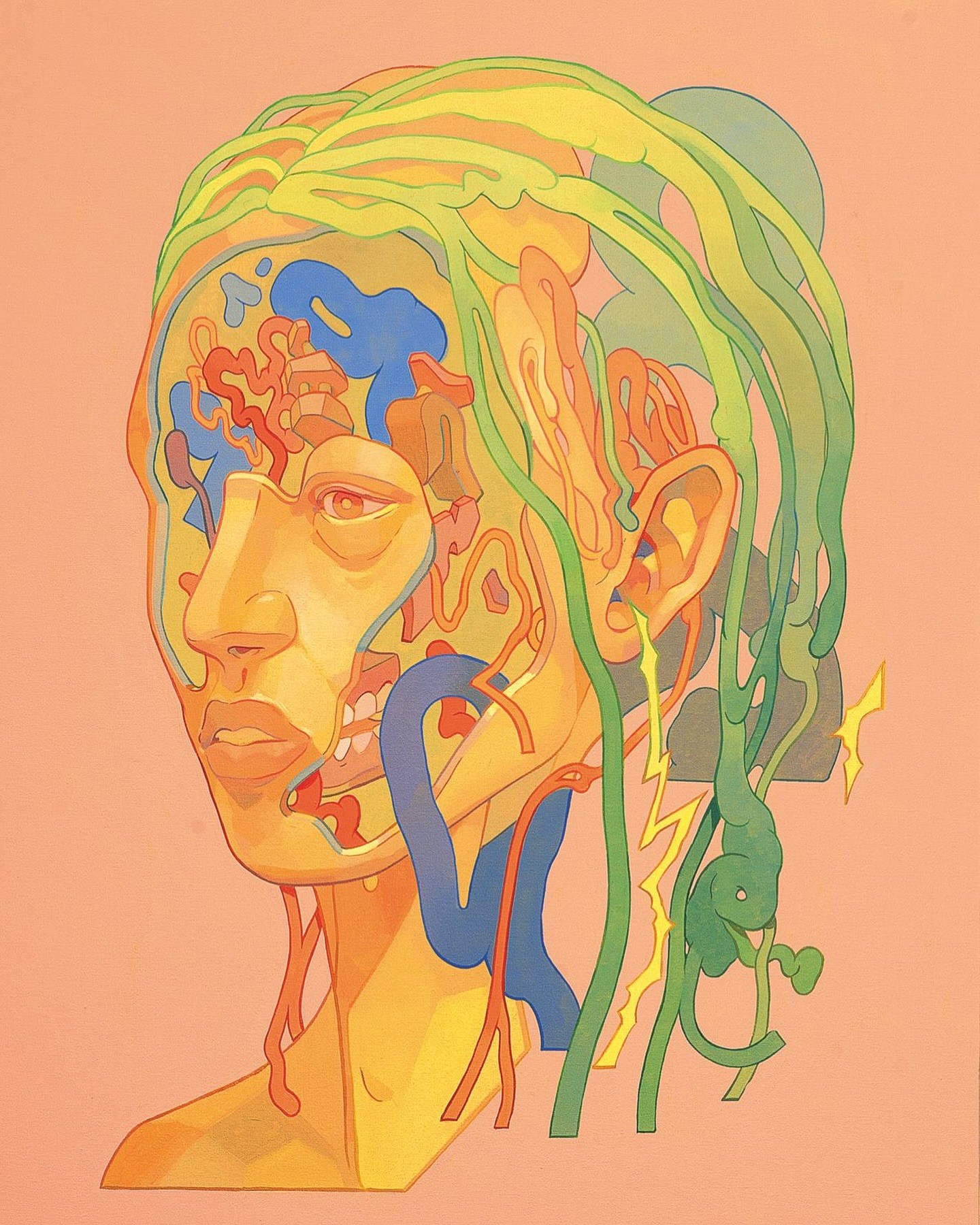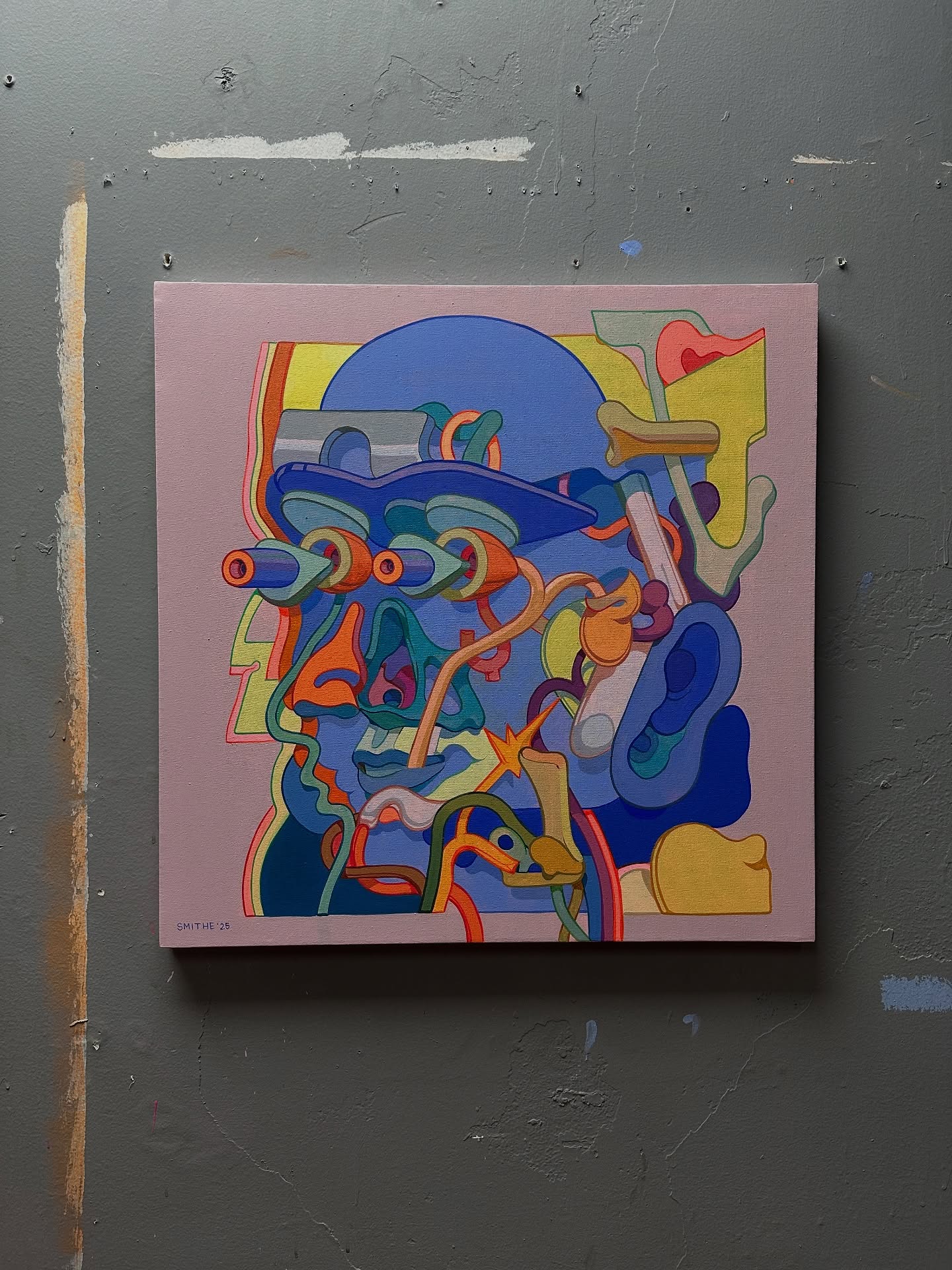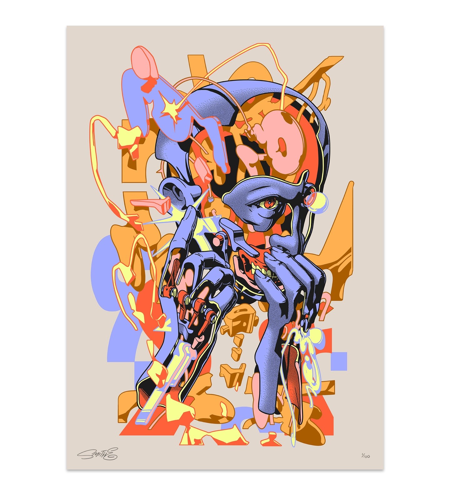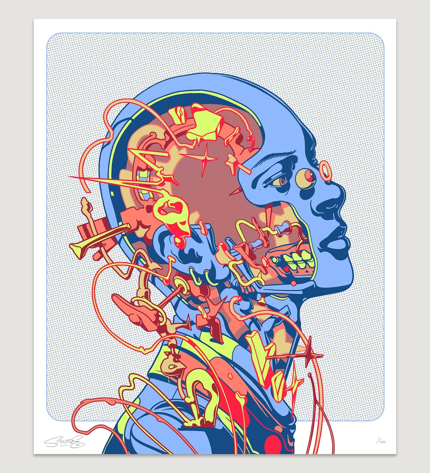 Smithe (Smitheone) (b. 1987, Mexico) is a self-taught artist who evolved from teenage graffiti into a multidisciplinary practice spanning painting, illustration, design, sculpture, music, and more. Influenced by vintage comics, mid-century graphics, and science fiction, he has developed a distinctive visual language centered on fragmented, machine-like figures. His work explores themes of identity, existentialism, and the tension between human and mechanical systems, often revealing inner structures through surreal “defragmented” forms. Exhibited internationally, Smithe continues to push and reinvent his style, bridging street culture with contemporary art in a way that feels both introspective and visually striking.